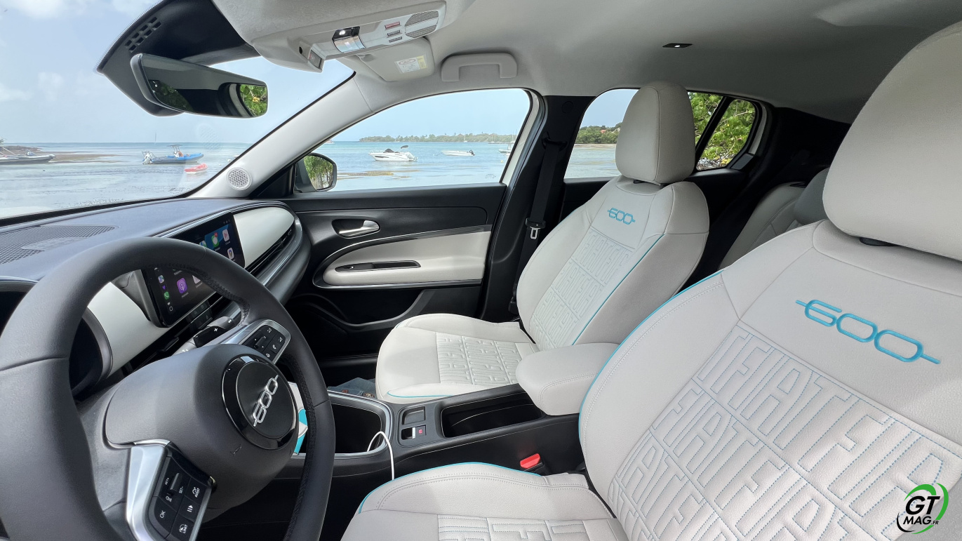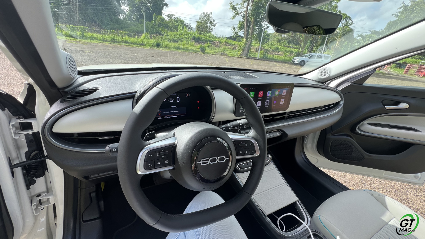 La finition haut de gamme de la Fiat 600, La Prima, ajoute la caméra de recul, les clignotants à LED, le chargeur à induction, la conduite autonome de niveau 2, la climatisation automatique, les détecteurs d’angles morts, le frein à main électrique, le hayon à ouverture mains libres, l’ouverture et le démarrage sans clés, le régulateur de vitesse adaptatif, la navigation, les vitres arrière surteintées et propose la sellerie ivoire soft touch et la lumière d'ambiance on est dans le raffinement à l'intérieur, c'est surtout la liste des équipements qui s'étoffe. Elle comprend notamment des aides à la conduite, comme la reconnaissance des panneaux de signalisation, le régulateur de vitesse adaptatif, la caméra de recul à 180°, des radars de stationnement à 360° et l'assistant aux embouteillages pour une conduite assistée de niveau 2. Côté confort, on peut compter sur l'ouverture et le démarrage sans clé, le hayon à ouverture électrique mains libres, la climatisation automatique et la navigation connectée.