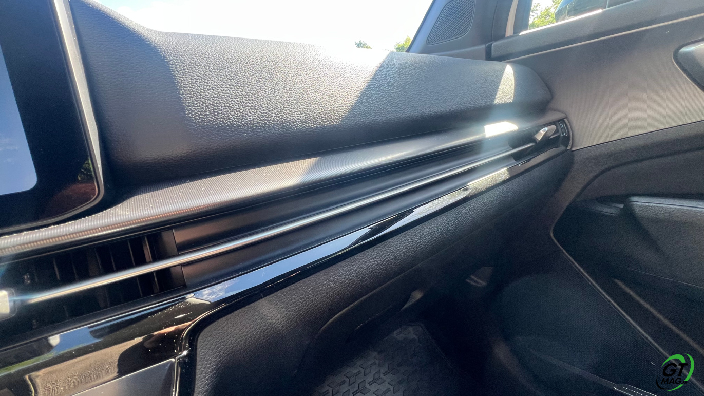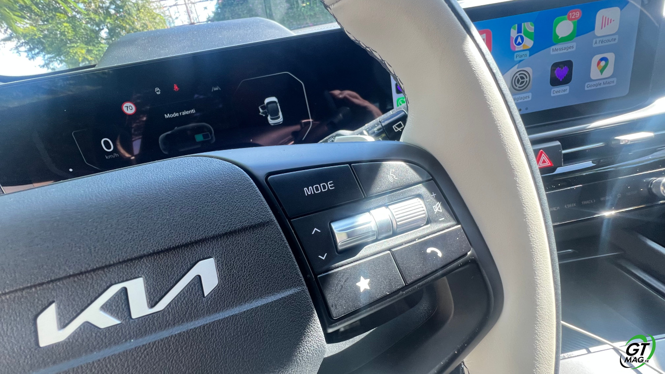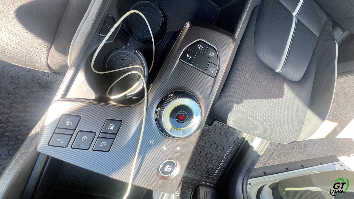 L’intérieur se transforme également très nettement…. Le Sportage hybride restylé reçoit de série un tableau de bord numérique de 10 pouces et un écran central tactile incurvé de 12,3 pouces réunis au sein d’une double dalle aux bords moins épais qu’auparavant. Les aérateurs de forme inédite sont maintenant rassemblés dans un bandeau ininterrompu courant sur toute la largeur de la planche de bord. Sous l’écran central, le réglage de la température passe toujours par des molettes. Les autres commandes de la ventilation sont plus ergonomiques. Entre le nouveau volant à deux branches et la console centrale, les ingénieurs ont su garder des boutons dédiés à certaines aides à la conduite, telle celle garantissant le maintien du véhicule dans sa voie. Conduite semi-autonome de niveau 2, caméras à 360° et chargeur de smartphone à induction font partie des équipements de notre modèle d’essai… Tout cela est résolument plus moderne…