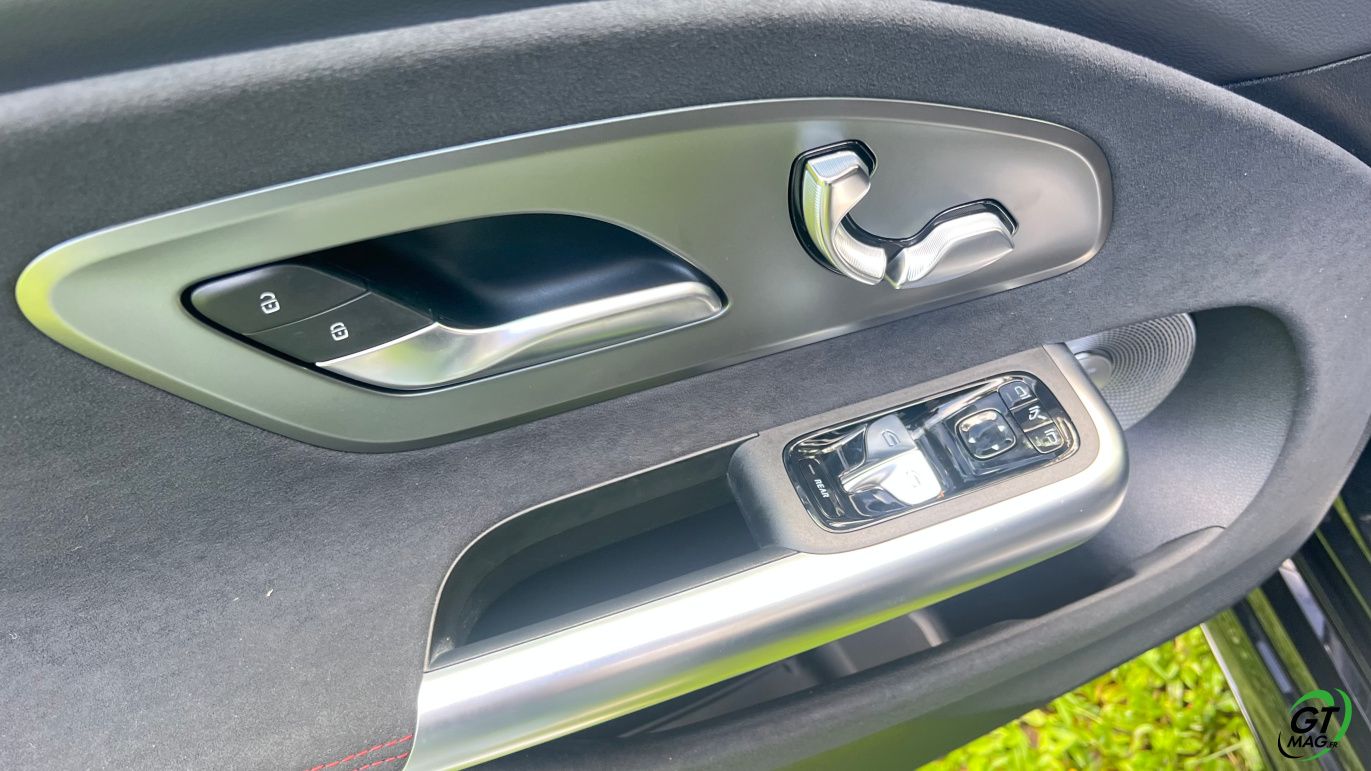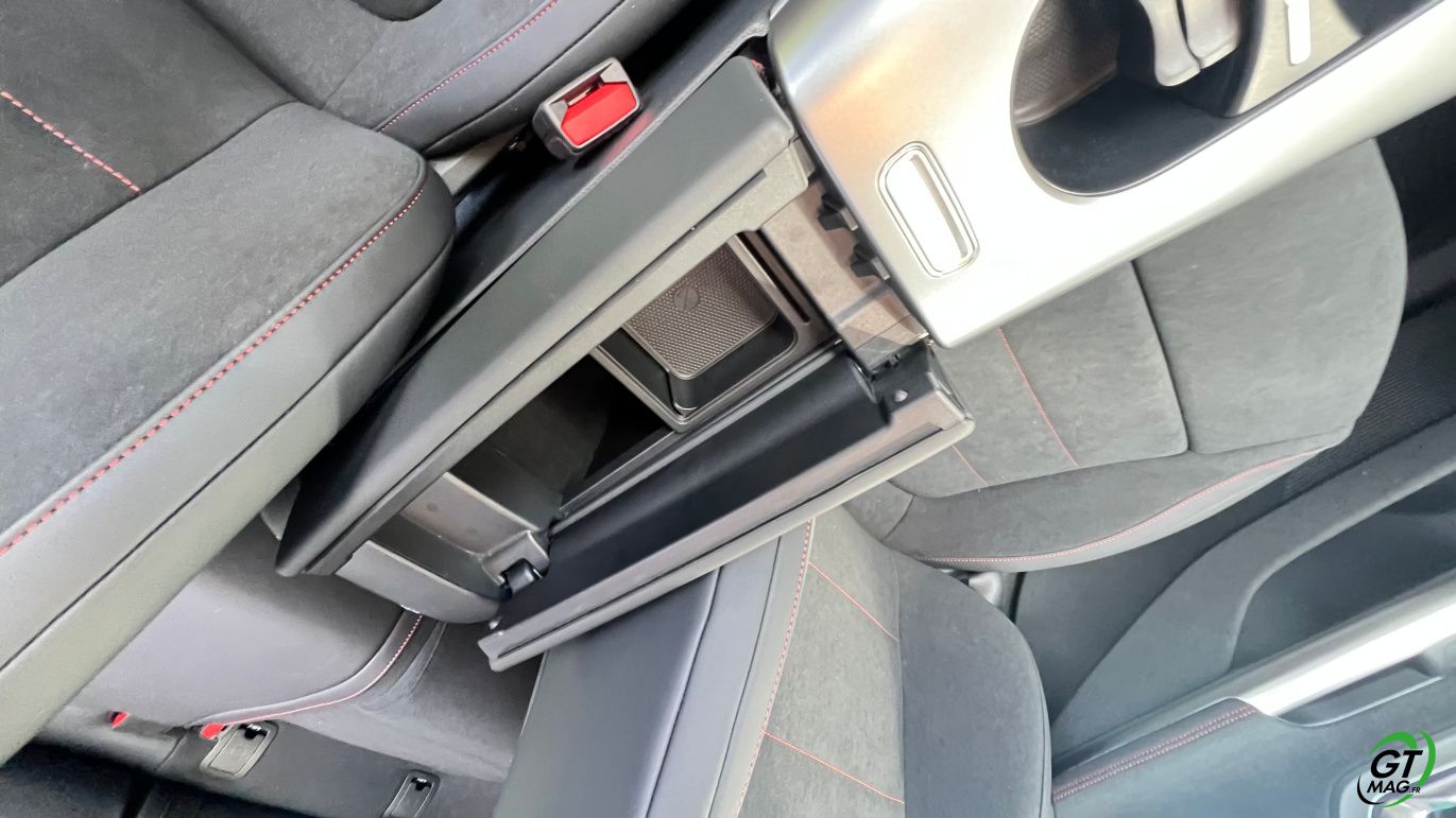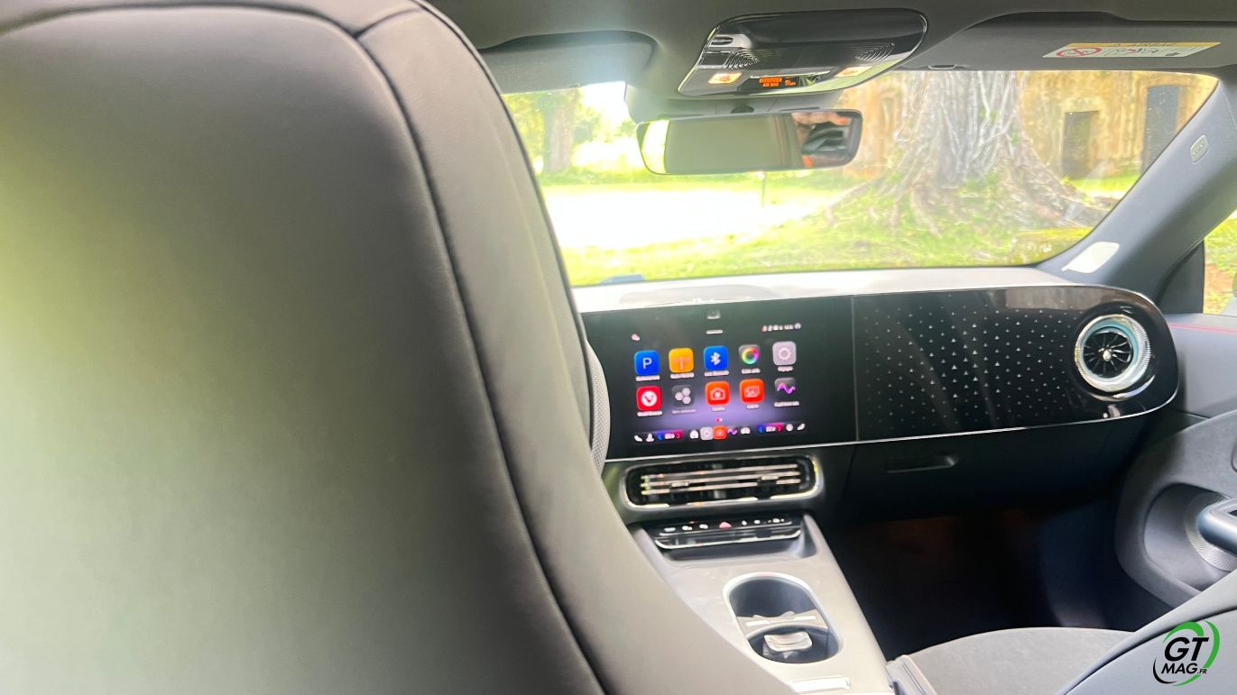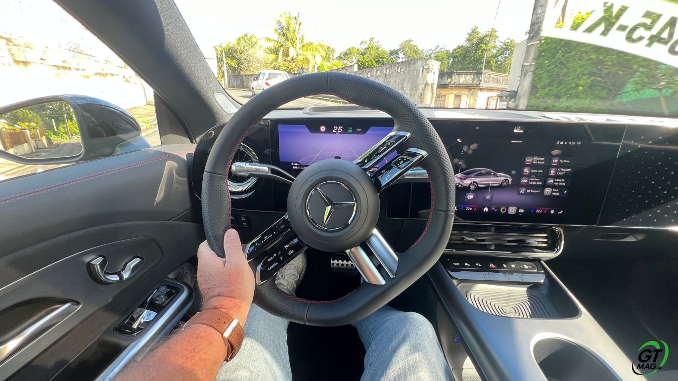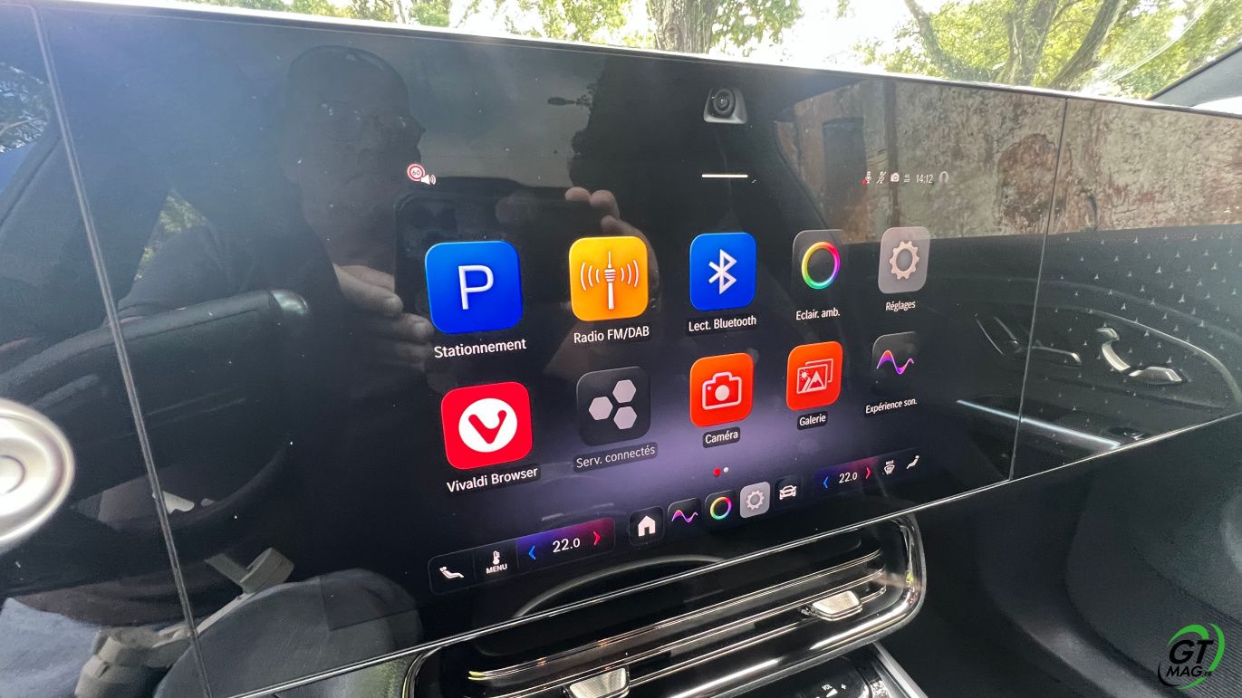 L’écran en lui-même est plutôt bien structuré, mais son fonctionnement diffère des systèmes Mercedes actuels. En effet, plutôt qu’un menu principal divisé en catégories, toutes les applications et menus sont regroupés dans un grand tiroir, à la manière d’un smartphone. La commande de la climatisation se fait également via l’écran, mais reste constamment visible. Sur la console centrale, seuls quelques boutons restent présents : ce sont ceux destinés aux modes de conduite, aux caméras de stationnement, à la désactivation de l’écran, aux feux de détresse, à l’assistant vocal et au volume. Les deux pavés tactiles sur le volant, qui permettaient auparavant de contrôler l’écran conducteur à gauche et l’infodivertissement à droite, ont disparu. Le volant, lui, sera prochainement mis à jour, puisqu’un tout nouveau modèle a fait ses débuts sur la Mercedes CLA avec… de vraies molettes physiques pour le volume et le régulateur de vitesse !