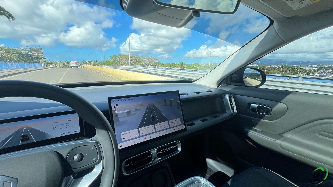 Les Leapmotor B10 et C10 partagent une plateforme et leurs technologies. Pas étonnant donc de retrouver le moteur électrique de 218 ch sur le train arrière du petit crossover. Il présente aussi une suspension McPherson à l’avant, 5 bras à l’arrière et même une répartition du poids 50/50. Ce dernier élément est sans doute aidé par les batteries. Eh oui, il y a en a deux au catalogue on l’a vu. En Martinique la grande batterie présente une capacité de 67,1 kWh, ce qui lui permet d’offrir une autonomie de 434 km. Elle charge à 168 kW elle prendra 20 min pour passer de 10 à 80 % de charge sur une borne rapide. Côté consommation et d’après mes petits calculs, il faudra toutefois tabler sur un appétit moyen gravitant autour des 16 à 18 kWh/100 km, soit près de 360 km à 390 km d’autonomie. Ma conduite, mon style ont été plutôt raisonnable flirtant parfois avec une écoconduite que je maitrise très bien, mais aussi des moments d’accélérations voulues et prolongées sur notre rocade ou autoroute…