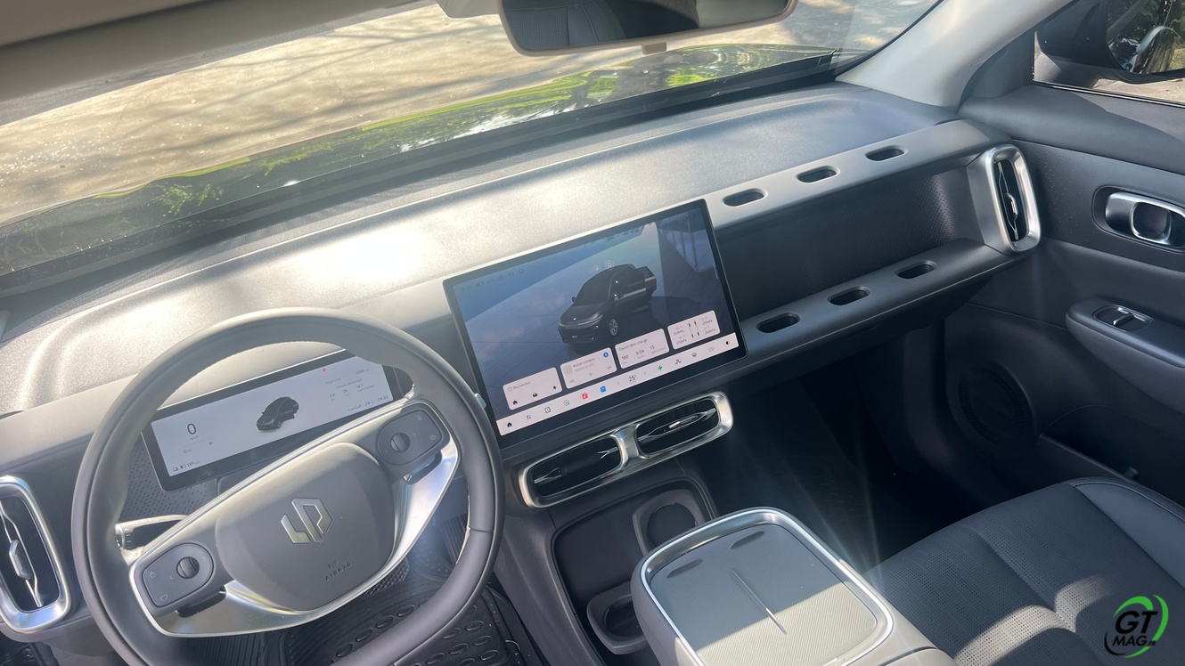 Dans l’habitacle, le Leapmotor B10 suit son propre chemin avec une planche de bord à deux étages. À notre grand étonnement et plaisir, on trouve des buses de ventilation, ainsi qu’un espace de rangement bien pratique devant le passager. En sus, il y a un grand bac dans la console centrale et deux porte-gobelets escamotables. Une chose est sûre : ce ne sont pas les rangements qui manquent ! D’ailleurs, toujours sur le point du rangement et de l’habitabilité : le Leapmotor B10 joue bien de sa taille pour offrir un habitacle généreux. Devant comme derrière, tous les passagers seront bien assis, tandis que le coffre taille à 430 litres. Mieux encore, il y a 25 litres d’espace sous le capot. Pratique pour les câbles ! Côté infodivertissement, tout passe va une grande dalle tactile de 14,6 pouces – en plus d’une instrumentale digitale de 8,8 pouces. Quand on dit « tout », c’est vraiment « tout », puisque le B10 ne présente aucun bouton. Pas même pour régler les rétroviseurs…