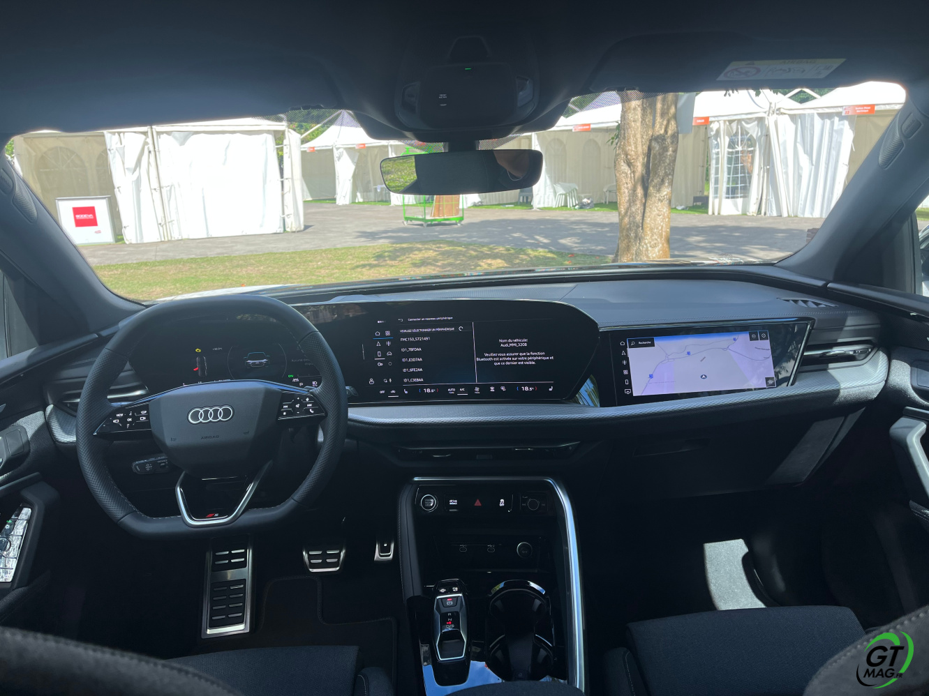 Aux places avant, ce Q5 cuvée 2025 adopte les nouveaux standards en matière de disposition des planches de bord, déjà vus notamment sur les Q6 e-Tron ou Audi A6 e-Tron. Elle se compose désormais d’une double dalle numérique arrondie légèrement tournée vers le conducteur avec une instrumentation numérique de 11,9 pouces et un écran multimédia de 14,5 pouces, pouvant être complétés sur la version SQ5 ou en option par un affichage tête haute et un écran face au passager. Cette disposition va progressivement se généraliser sur les autres modèles de la marque. Le nouveau système d’infodivertissement MMI de l’Audi Q5 fonctionne sous Android Automotive, ce qui signifie que les services Google sont intégrés (en ce compris la navigation via Google Maps) et que des applications tierces comme Spotify ou YouTube peuvent être installées directement, sans passer par un smartphone ! La compatibilité avec Apple CarPlay et Android Auto sans fil est bien entendu assurée…De plus les deux écrans peuvent se voir complétés en option par un troisième écran en face du passager, de 10,5 pouces, dont la fonction "Privacy" empêche le conducteur de voir ce qu'il diffuse en roulant. Il permet au passager de contrôler le multimédia, la connectivité smartphone, la navigation, ou même de jouer à des jeux. L'écran central permet aussi ce divertissement, mais à l'arrêt seulement.