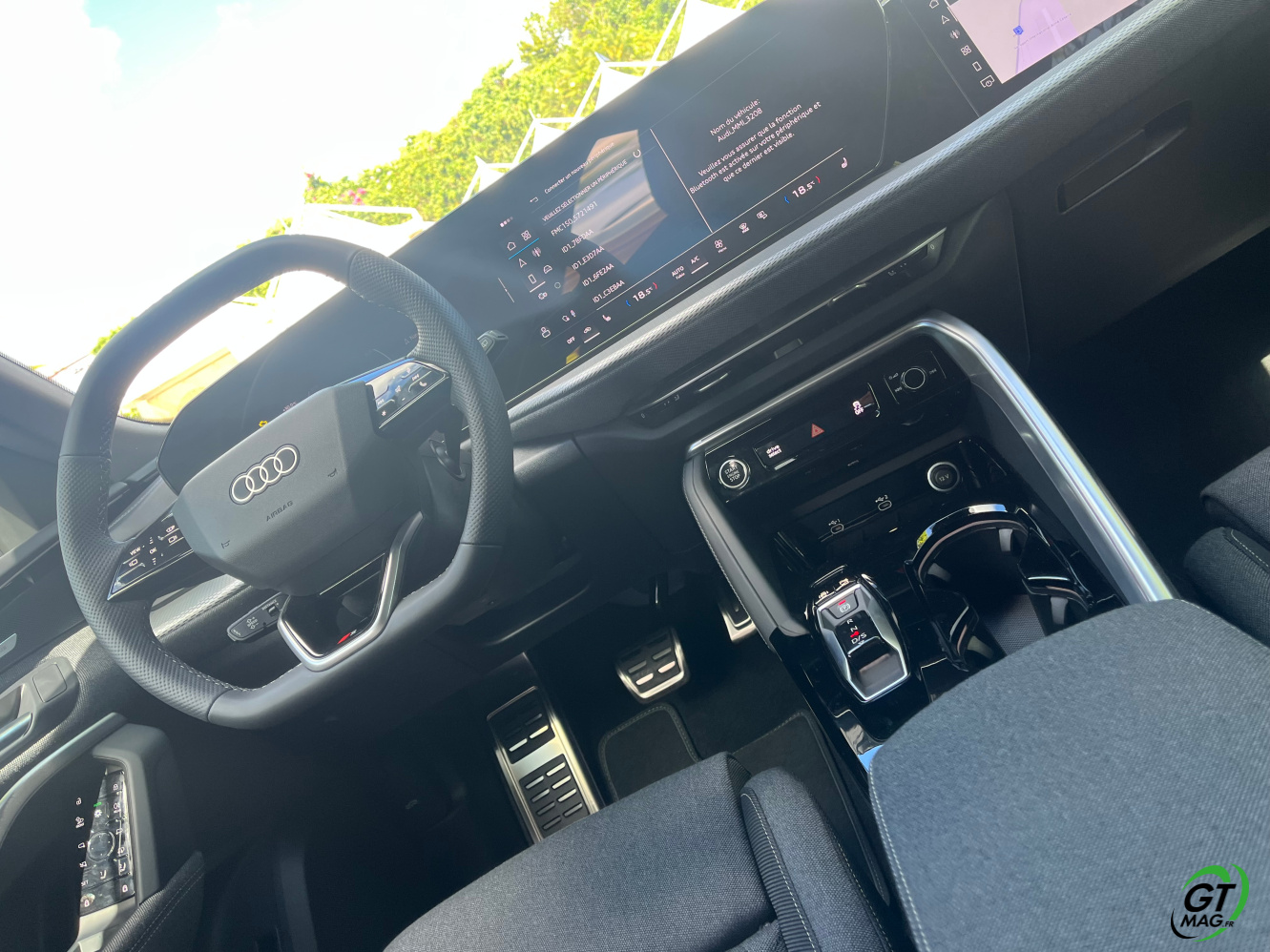 Question ligne, la sobriété est de rigueur comme d’habitude chez Audi. Avec des optiques placées 4 cm plus haut que dans l’ancien modèle, le Q5 s’affirme de façon plus virile. Audi offre à ses clients huit signatures lumineuses différentes, un détail que certains apprécieront pour personnaliser leur voiture. A l’arrière, le constructeur aux anneaux a soigné la présentation de son SUV avec un large bandeau lumineux OLED dans les animations sont également personnalisables. Audi a adapté à la version Sportback le quatrième feu stop s’affichant par projection sur le haut de la lunette arrière. On peut également se réjouir de la présence de vraies sorties d’échappement en acier, un détail plus « premium » les canules factices que l’on voit souvent chez les autres constructeurs. Alors que beaucoup de constructeurs automobiles font le choix délibéré de revenir à des commandes physiques, Audi se démarque en proposant de plus en plus de fonctions tactiles sur le volant et les panneaux de portes.