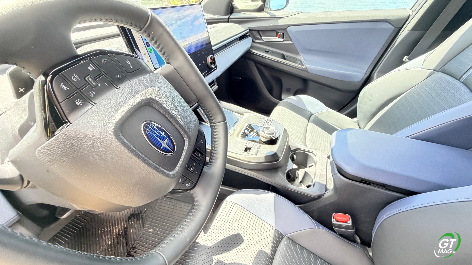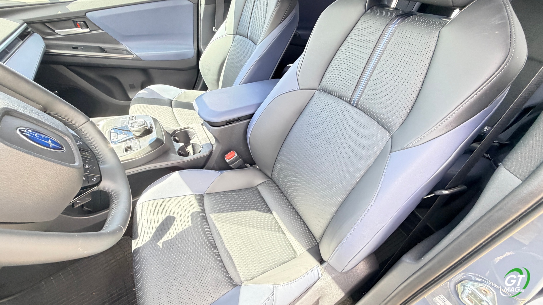 Je prends place à bord, et la première impression est celle d'un SUV qui a appris à respirer. Le Solterra 2026 profite de l'architecture dédiée aux véhicules électriques pour offrir un plancher totalement plat entre les deux sièges avant — fini le tunnel central encombrant. À la place, une large console flottante, épurée, qui libère un espace de rangement généreux accessible aussi bien depuis l'avant que depuis l'arrière. À l'avant, les sièges ont été revus pour ce millésime. Le maintien latéral est meilleur, le galbe plus prononcé, et le rembourrage a gagné en densité. On apprécie la position de conduite surélevée, typique des SUV Subaru, qui offre cette sensation de dominer la route sans pour autant sacrifier l'aérodynamique. La visibilité vers l'avant est bonne, même si les montants arrière restent un point faible, comme souvent sur ce type de carrosserie.