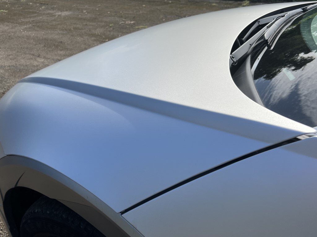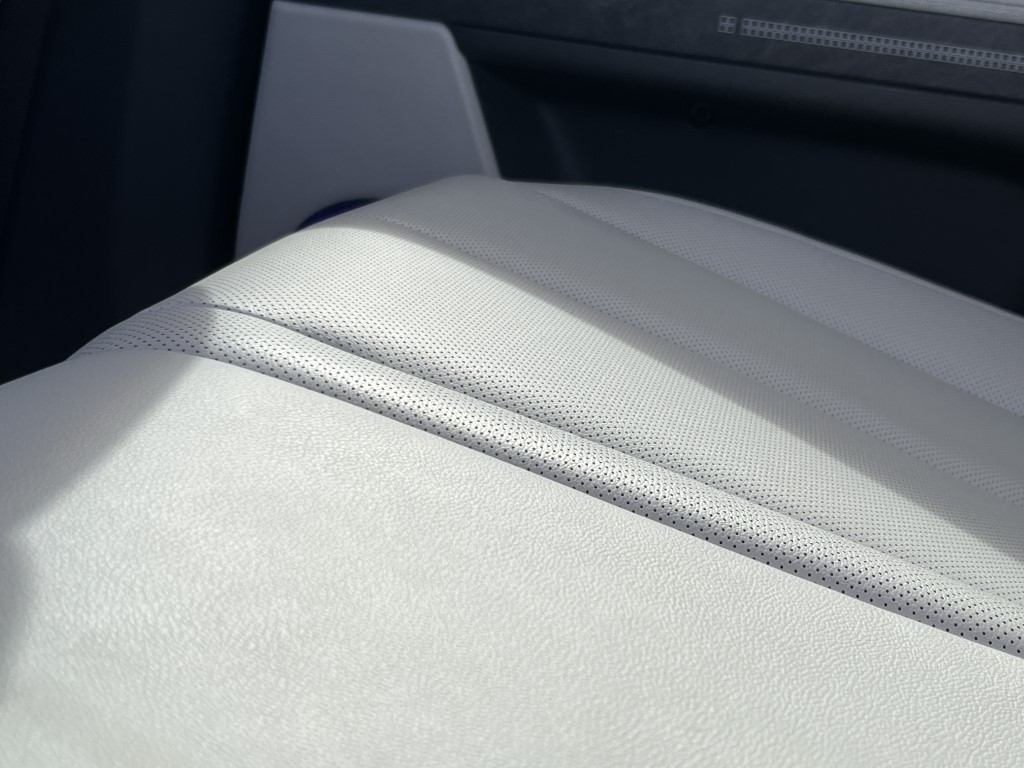 Sur le capot et les flancs, les surfaces planes s’articulent entre elles par des lignes de fracture franches et tendues. C’est à la fois avant-gardiste, mais aussi minimaliste et de bon goût, tout comme les poignées affleurantes qui deviennent presque la norme sur les nouveaux véhicules électriques. Surtout, cela contribue à renforcer l’apparence massive, et vraiment spaciale de la voiture. À noter que sous le capot avant, on trouve un coffre secondaire de 24 ou 57 litres selon la version. Il permet, au pire, de ranger les câbles de charge et, au mieux, de loger un sac de voyage. Autour des passages de roues, un léger relief en turbine crée du dynamisme même à l’arrêt.