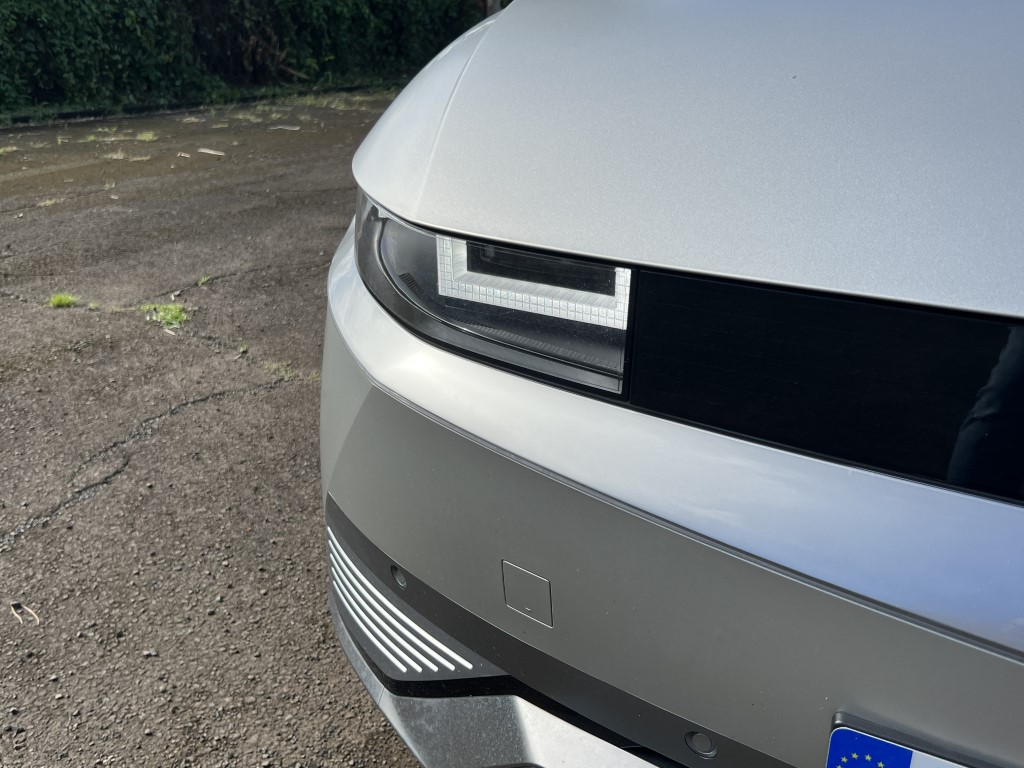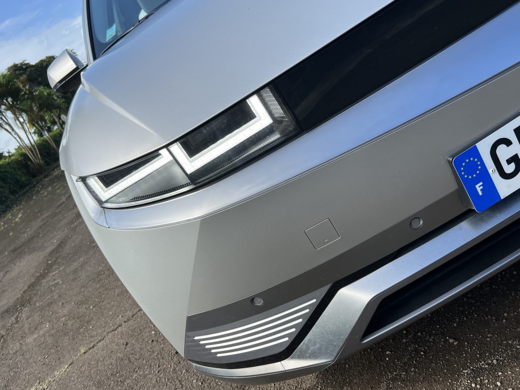 Côté lignes … À l’avant, la calandre fermée est surplombée par les feux pixelisés rectangulaires qui ne manquent pas de rappeler la De Lorean de Retour vers le futur. Ils sont enfermés dans un bandeau translucide dont le lien avec le bouclier est assuré par une surface en flèche rétroéclairée par des LED (qui fonctionnent uniquement à l’arrêt en France) installées de série sur toute la gamme. Oui Hyundai n’a pas cédé à la mode des clignotants à défilement, tant à l’avant qu’à l’arrière. De profil, l’IONIQ 5 a une longueur semblable au Tucson, duquel les formes des portières sont reprises. Les jantes de 20 pouces au design « pixelisé » apportent une touche techno à l’ensemble de la voiture.
