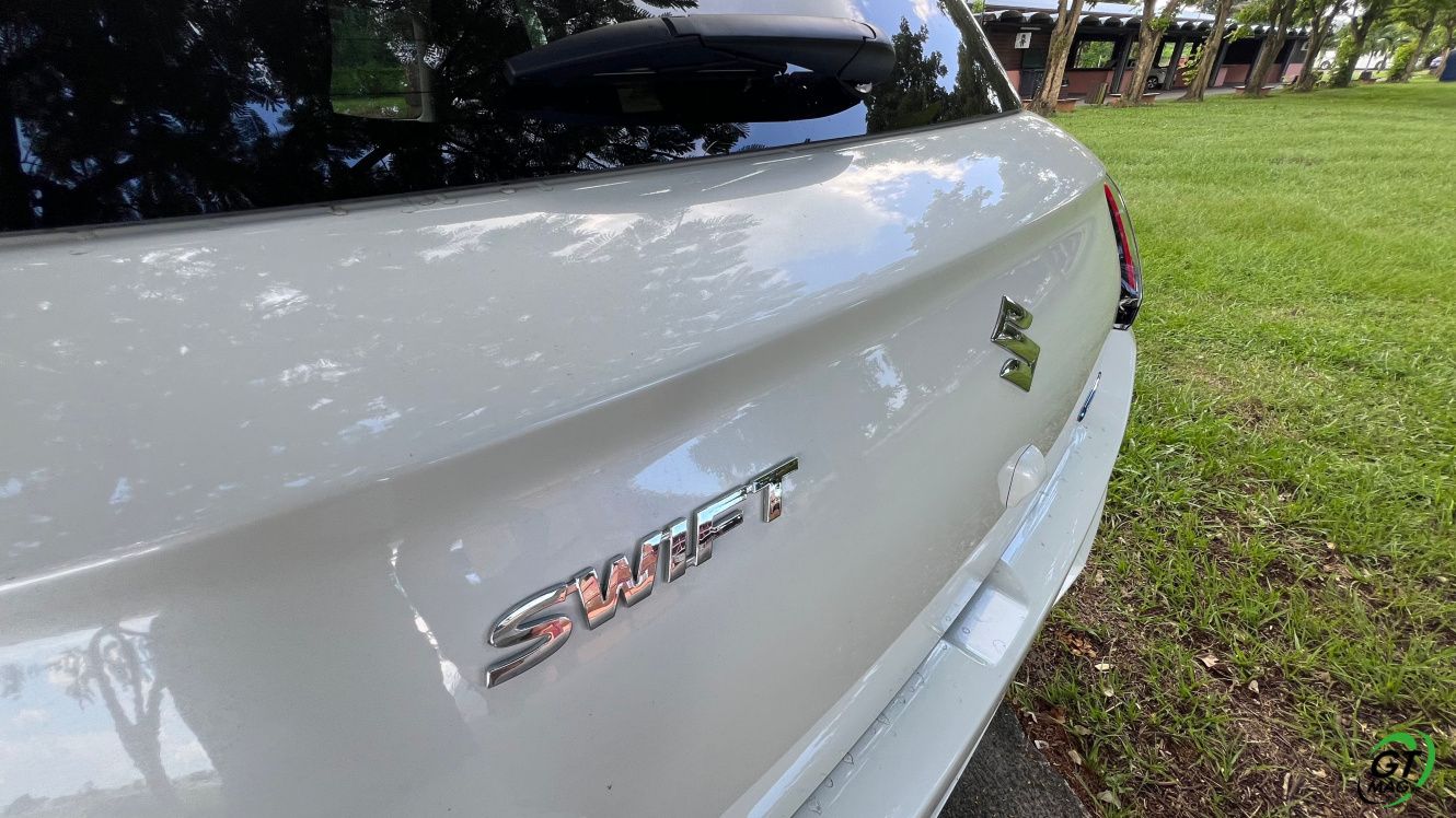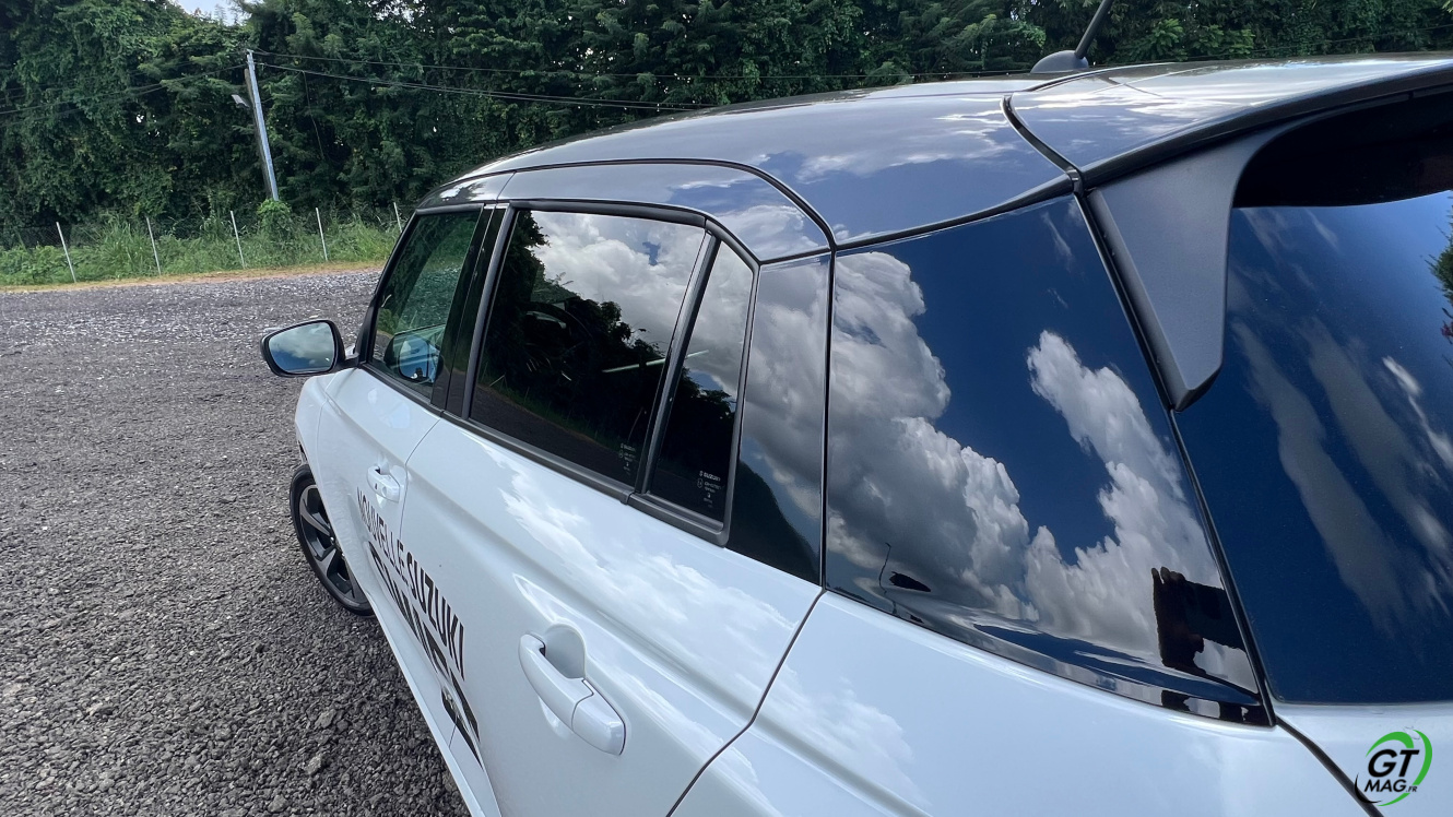 Avec moins de 4 mètres (3,86 m exactement), pour 1,74 m de large et 1,50 m de haut la Swift garde son allure compacte… La ceinture de caisse reste haute et les ailes élargies assurent une particularité visuelle à la voiture qui ne manque pas d’attirer le regard, en particulier grâce à une face avant bien à elle. Sa calandre en nid d’abeille très calitative est encadrée de bloc optique qui intègrent un éclairage Led en forme de L et répond à l’effet tridimensionnel de feux arrière. Le toit noir permet d’avoir un effet de pavillon flottant qui améliore grandement le look de la Suzuki Swift… L’arrière lui est plutôt réussi, sobre, avec des bonnes proportions, l’auto me parait bien équilibrée. Les nouveaux feux arrière à Leds disposent d’une signature lumineuse en C. La partie basse du bouclier dispose d’un feu antibrouillard arrière, le seul sur la nouvelle Swift car il n’y en a plus à l’avant.
