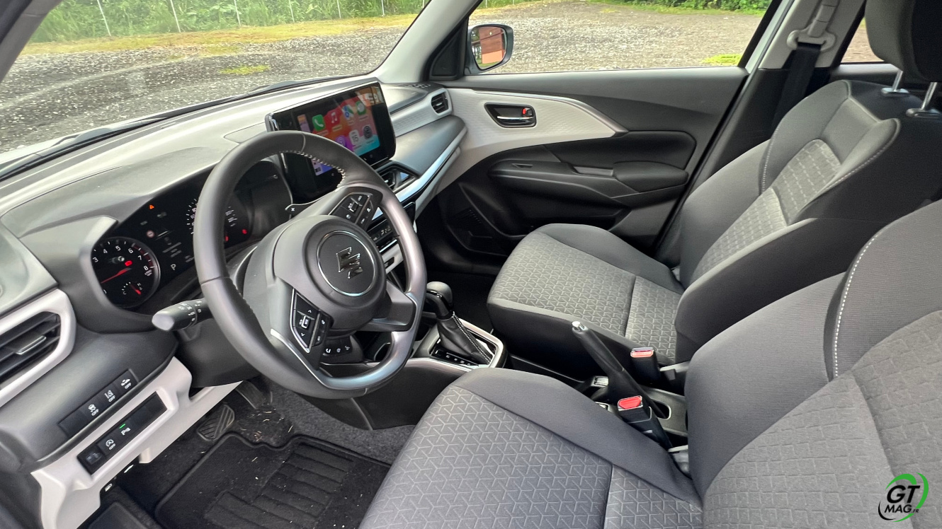 La nouvelle Swift gagne en modernité avec un nouvel écran tactile HD en haut de planche de bord et disposant de la connectivité sans fil Car Play et Android Auto. Dans l’ensemble, il se montre plutôt réactif et offre une bonne lisibilité. L’espace aux places avant et arrières est suffisant pour accueillir 4 personnes pour des courts trajets urbain et péri urbain. A noter un coffre logeable, de forme rectangulaire avec un seuil de coffre plutôt bas qui propose un volume de 265 l, largement suffisant pour le quotidien et même envisager des week-ends à la campagne à plusieurs.