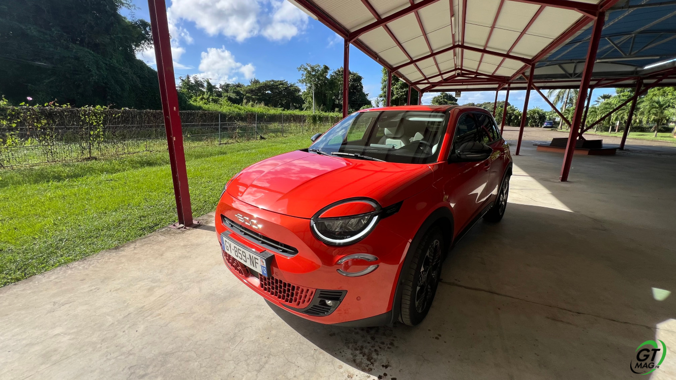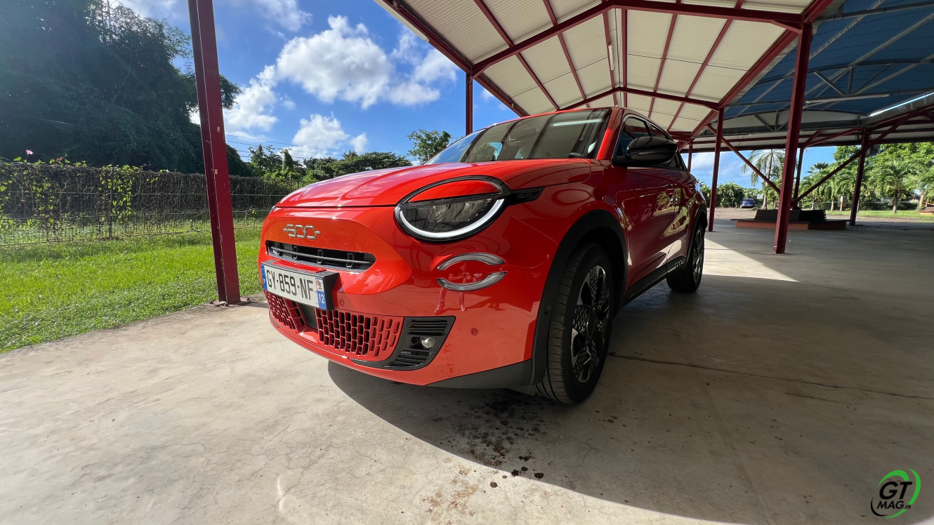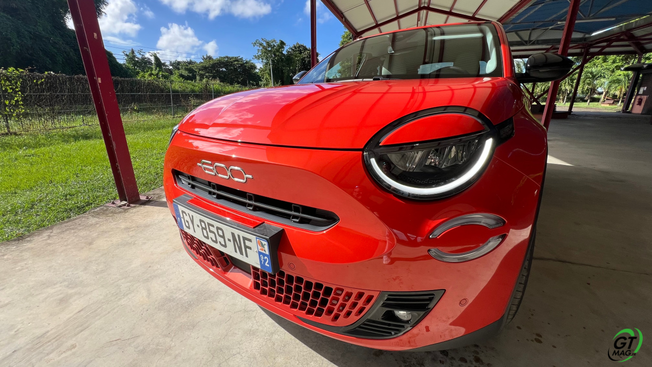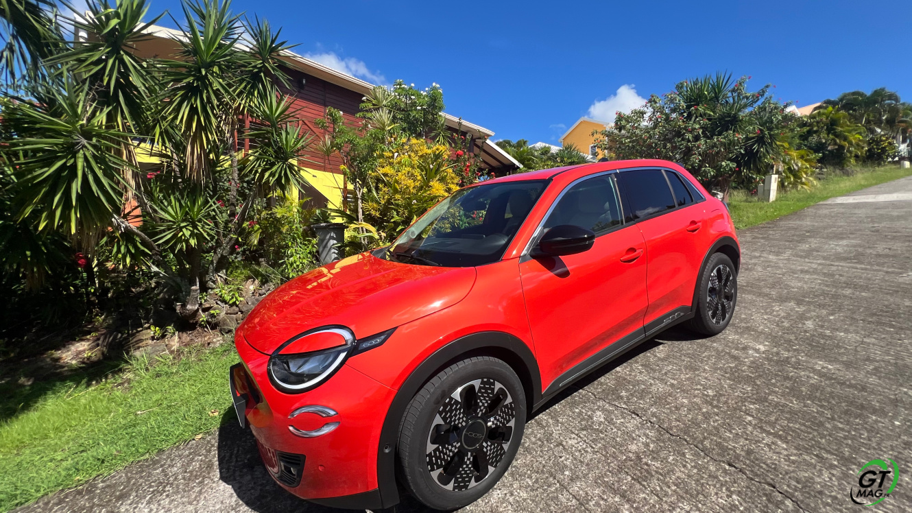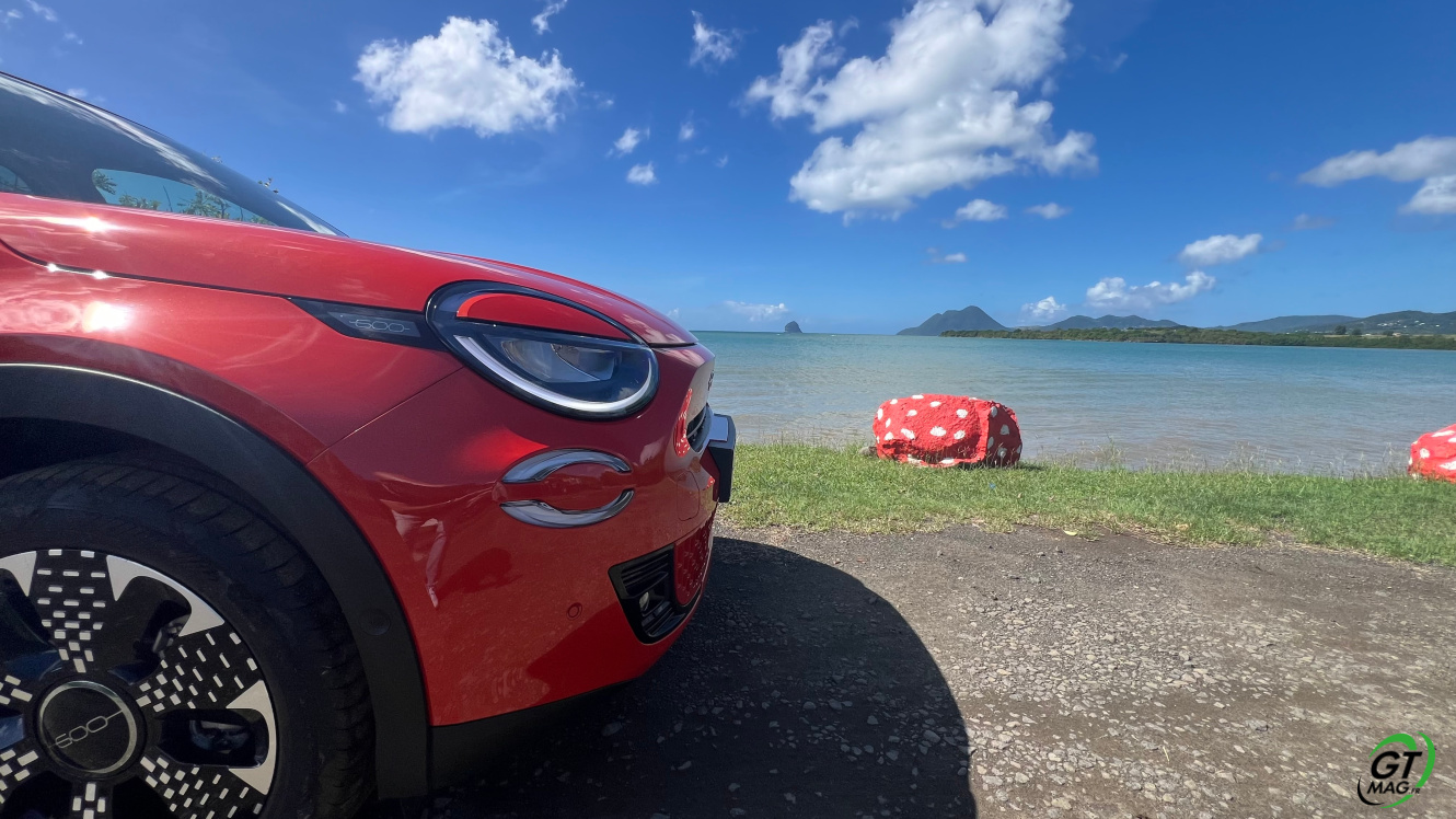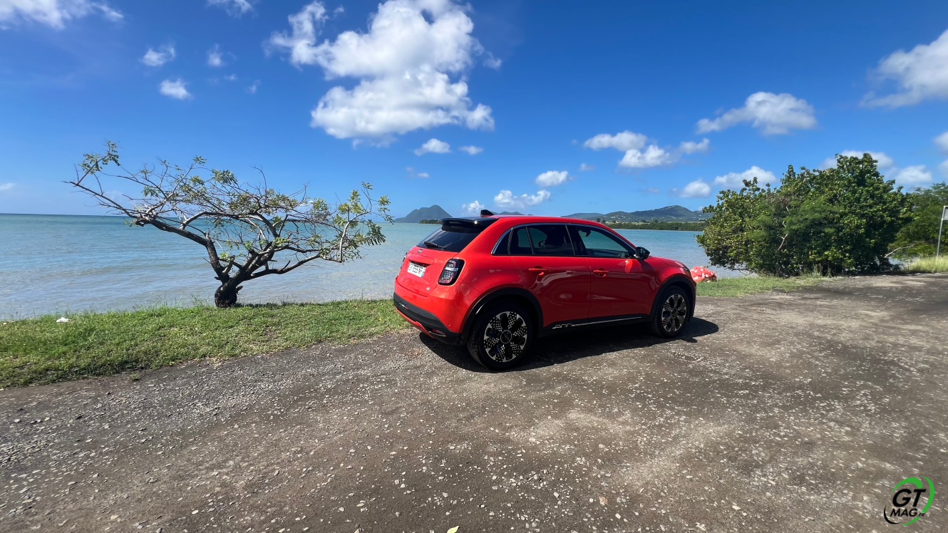 La nouvelle Fiat 600e est disponible en deux versions. La version de base, appelée RED, est proposée disponible en blanc ou en noir, en plus de la couleur rouge obligatoire. Ceux qui veulent une Fiat grise peuvent l'oublier, car Fiat a récemment décidé de ne plus vendre de voitures grises. Pour monter dans les options, vous avez la ‘La Prima’ notre essai ce matin en Martinique avec un meilleur équipement de série et un plus grand choix de couleurs. Elle propose même un siège massant à l'avant, des jantes en aluminium plus grandes, l'accès sans clé et du cuir végétal ou le hayon à ouverture électrique entre autres. Il faut lire notre article pour avoir toutes les options de la voiture le lien est sur cet essai…