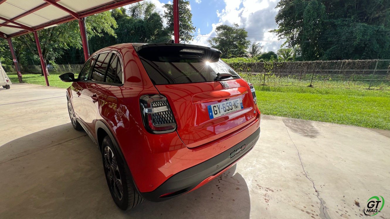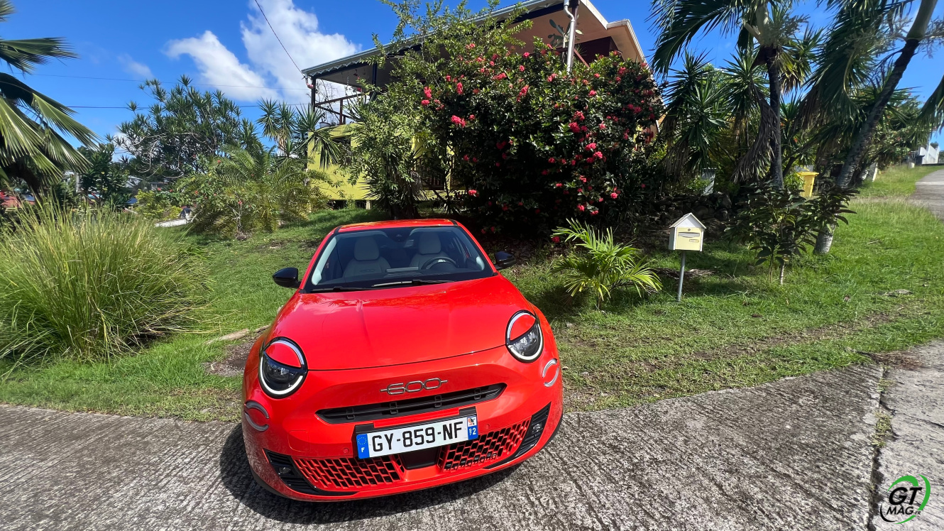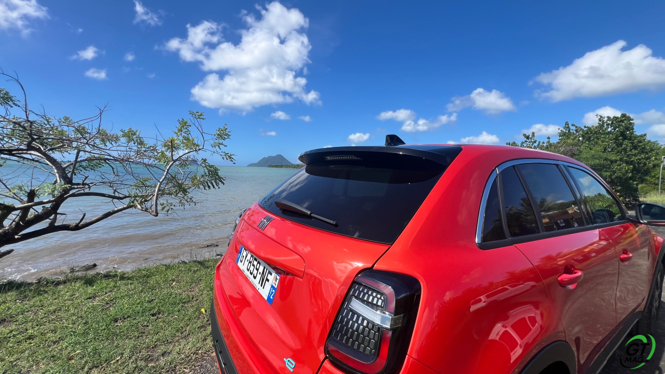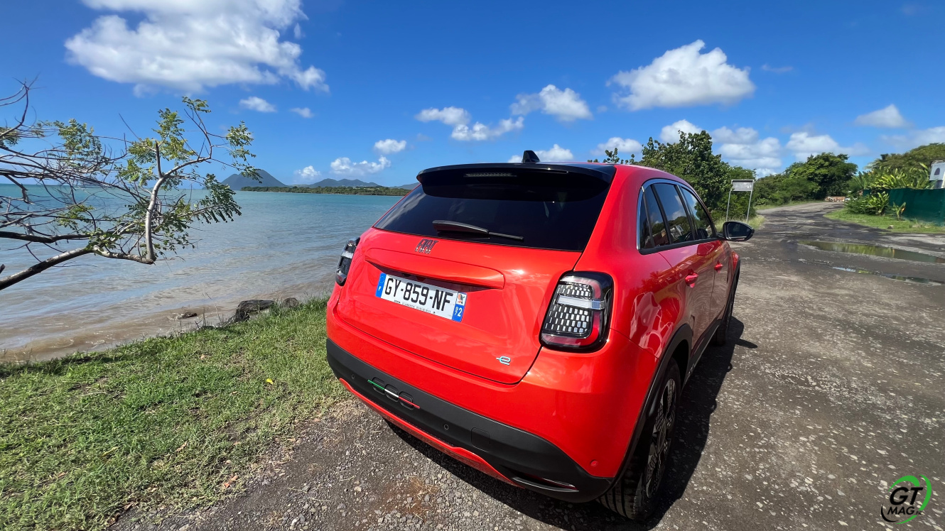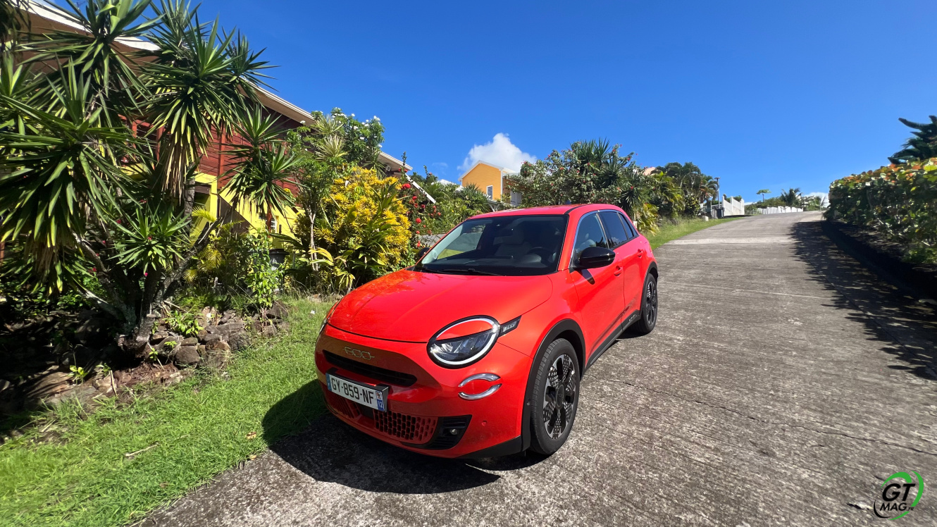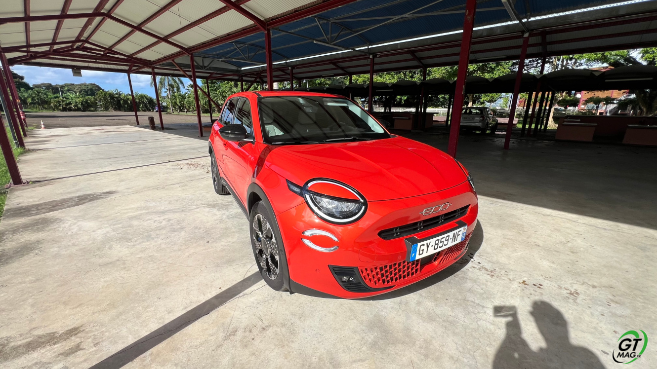 La nouvelle Fiat 600e est disponible en deux versions. La version de base, appelée RED, est proposée disponible en blanc ou en noir, en plus de la couleur rouge obligatoire. Ceux qui veulent une Fiat grise peuvent l'oublier, car Fiat a récemment décidé de ne plus vendre de voitures grises. Pour monter dans les options, vous avez la ‘La Prima’ notre essai ce matin en Martinique avec un meilleur équipement de série et un plus grand choix de couleurs. Elle propose même un siège massant à l'avant, des jantes en aluminium plus grandes, l'accès sans clé et du cuir végétal ou le hayon à ouverture électrique entre autres. Il faut lire notre article pour avoir toutes les options de la voiture le lien est sur cet essai…