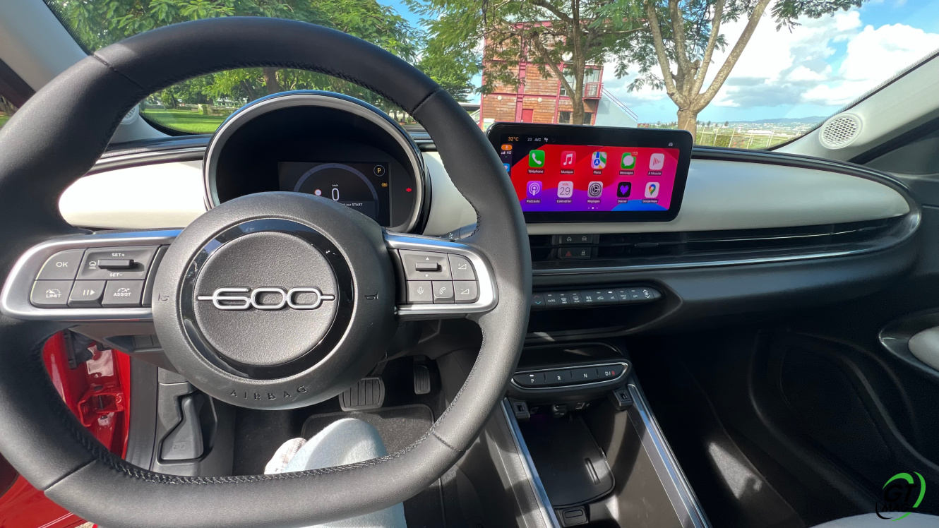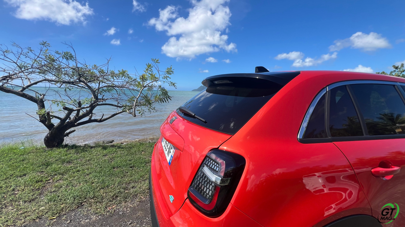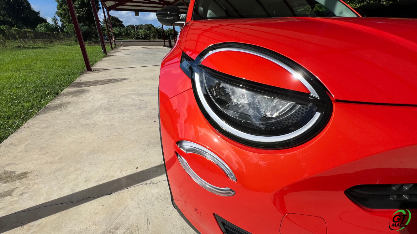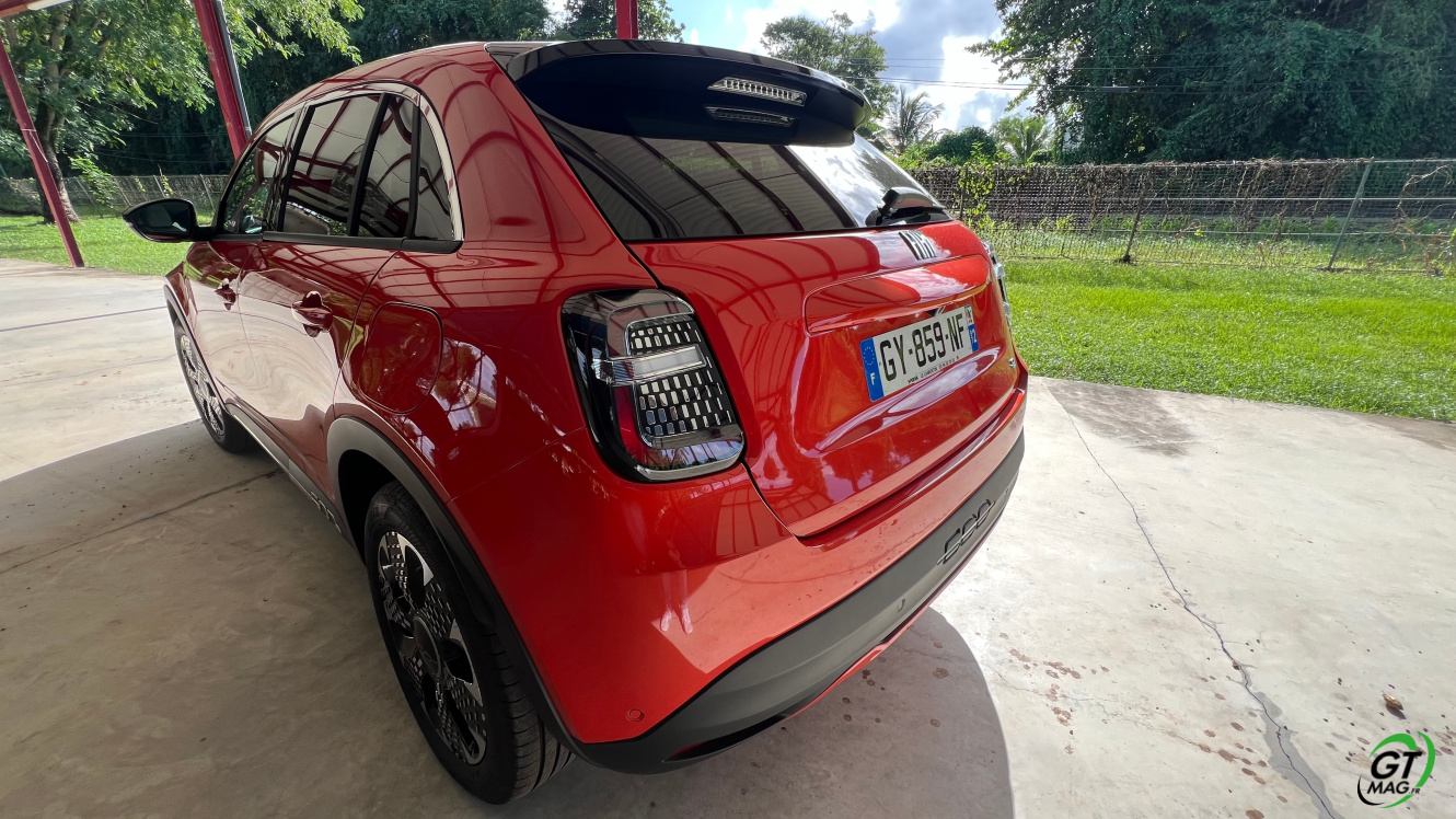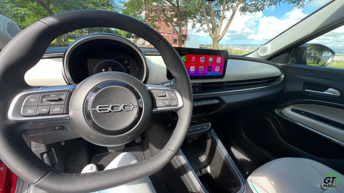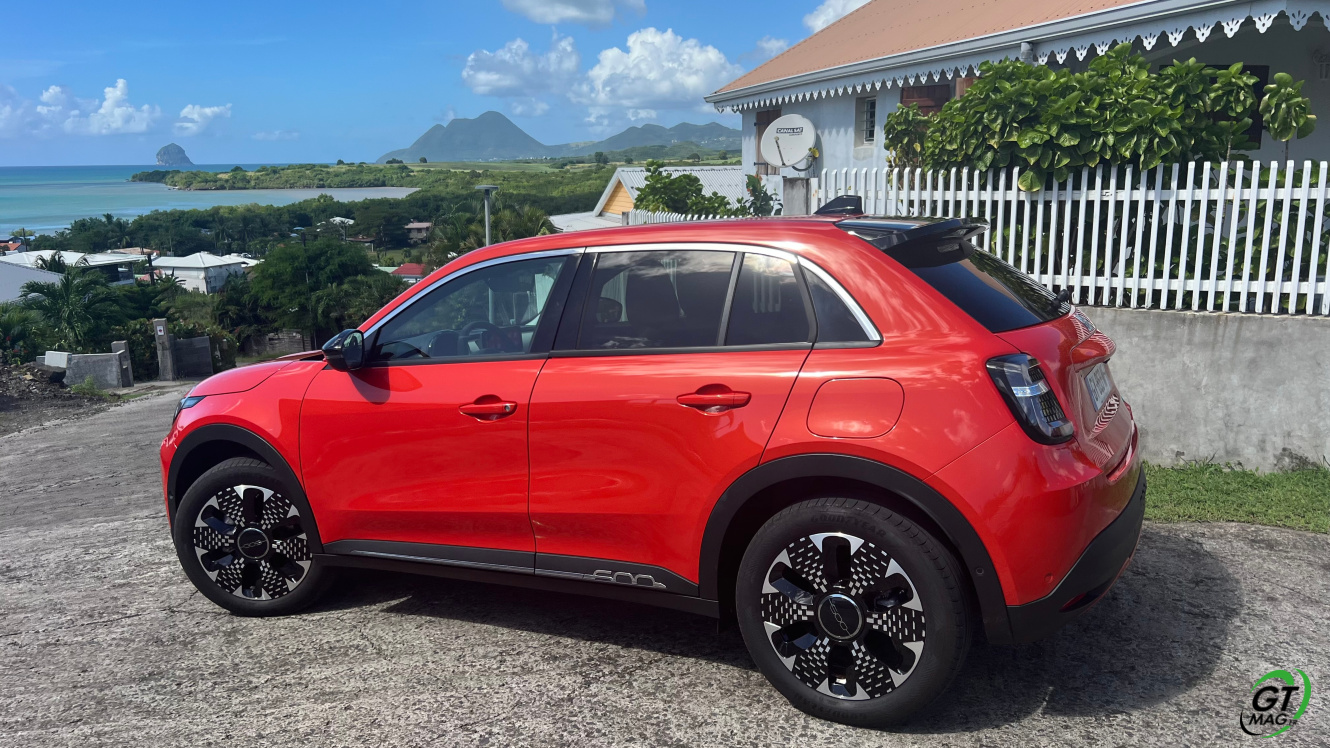 La nouvelle Fiat 600e est disponible en deux versions. La version de base, appelée RED, est proposée disponible en blanc ou en noir, en plus de la couleur rouge obligatoire. Ceux qui veulent une Fiat grise peuvent l'oublier, car Fiat a récemment décidé de ne plus vendre de voitures grises. Pour monter dans les options, vous avez la ‘La Prima’ notre essai ce matin en Martinique avec un meilleur équipement de série et un plus grand choix de couleurs. Elle propose même un siège massant à l'avant, des jantes en aluminium plus grandes, l'accès sans clé et du cuir végétal ou le hayon à ouverture électrique entre autres. Il faut lire notre article pour avoir toutes les options de la voiture le lien est sur cet essai…