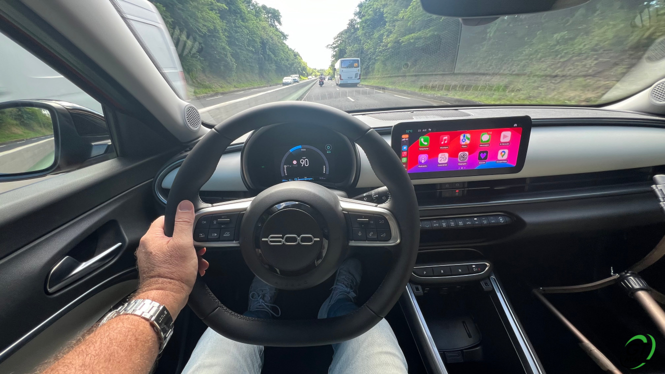 La nouvelle Fiat 600e propose trois modes de conduite - éco, normal, sport - sélectionnables en fonction du style de conduite souhaité. Pour trouver de vraies et belles sensations le mode sport s’avère souvent utile… Très polyvalente sur la route le FIAT 600e me surprend par son agilité et son confort de conduite… Je lui trouve une bonne tenue de caisse en virage. Cool, les aides à la conduite non envahissantes L’insonorisation est réussie, les bruits parasite et les bruits de roulement sont bien maîtrisés tandis que la puissance du moteur est suffisante pour rouler normalement dans le trafic et dépasser avec la pêche nécessaire, même si les sensations de conduite sont plutôt sans aspérités. Direction précise et douce, belle agilité entre nos petites routes, c’est du positif. Les suspensions ? Confortables, assez surement… Une motorisation hybride est également proposée avec un moteur 1.2 Hybrid 100ch DCT6… JMarc Wollscheid pour Gtmag.fr