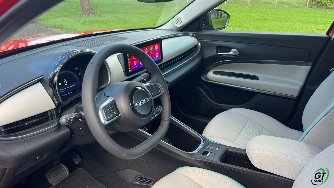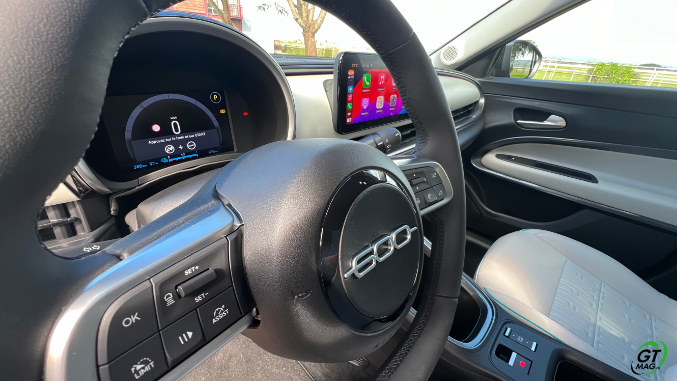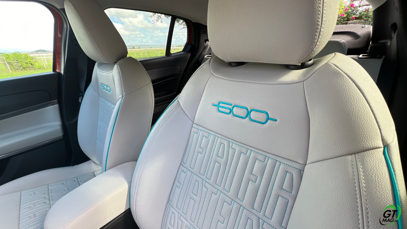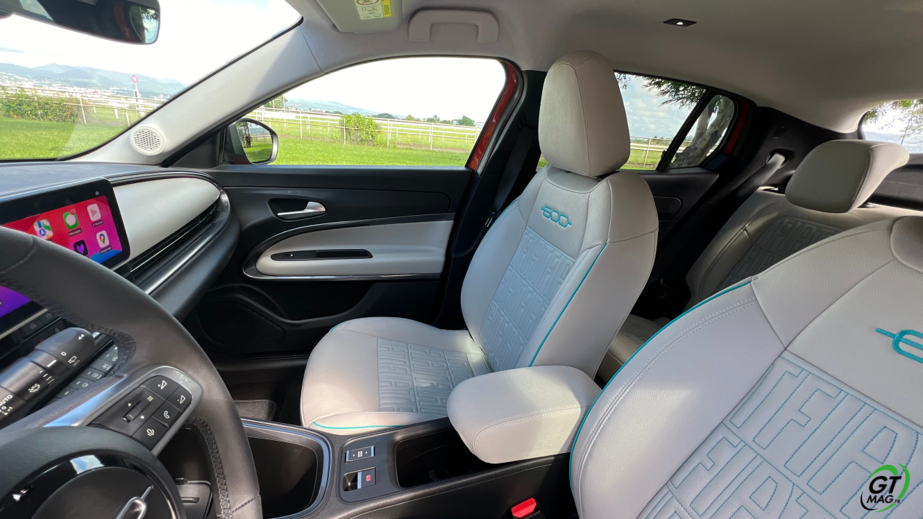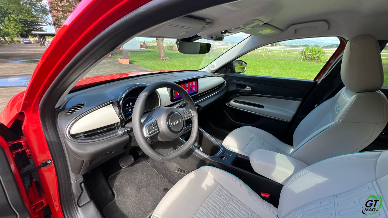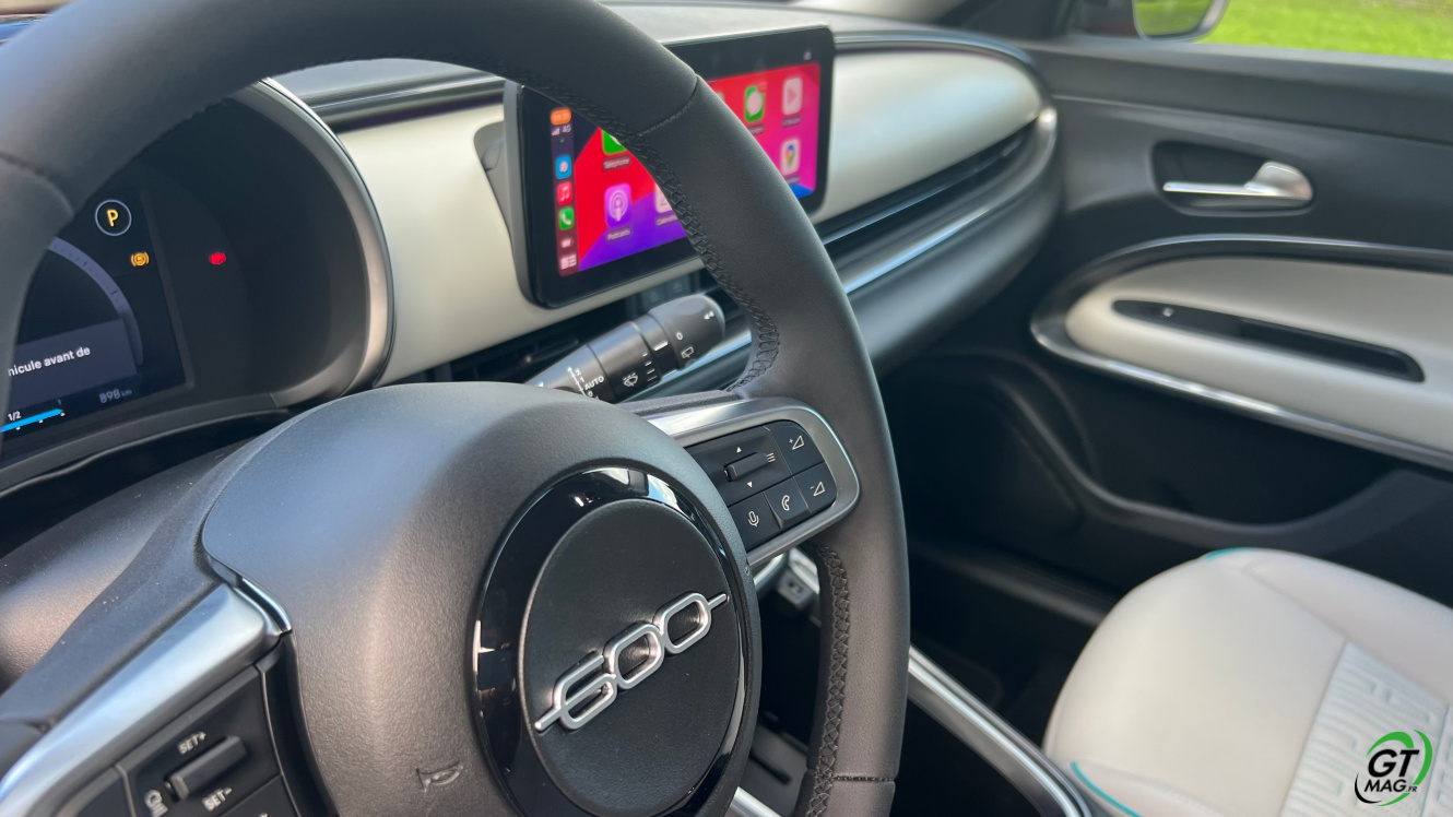 Parlons d’entrée aussi de son groupe motopropulseur et l'ensemble électrique. Le pack de batteries couvre 54 kWh bruts, ce qui équivaut à 51 kWh nets, couplés à un moteur électrique de 156 ch et 260 Nm de couple l’ensemble de propulsion est issu de la toute nouvelle banque d’organes électriques du groupe Stellantis qu’elle partage avec la récente Jeep Avenger que GTMAG à également essayé pour vous... Le système permet de passer, de l'arrêt à 100 km/h en 9 secondes. Côté autonomie ce n’est pas si mal, la Fiat 600e revendique une autonomie WLTP de 400 kilomètres. En ville, elle peut atteindre les 600 kilomètres selon votre façon de conduire plus ou moins agressive. Le mode éco vous sera très utile…