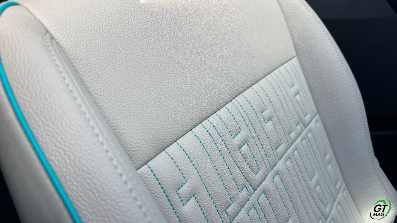 • Sellerie premium ivoire soft touch avec logo 600 et surpiqûre bleu azur