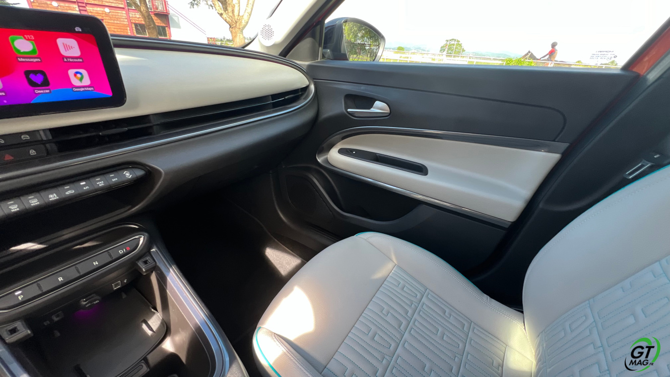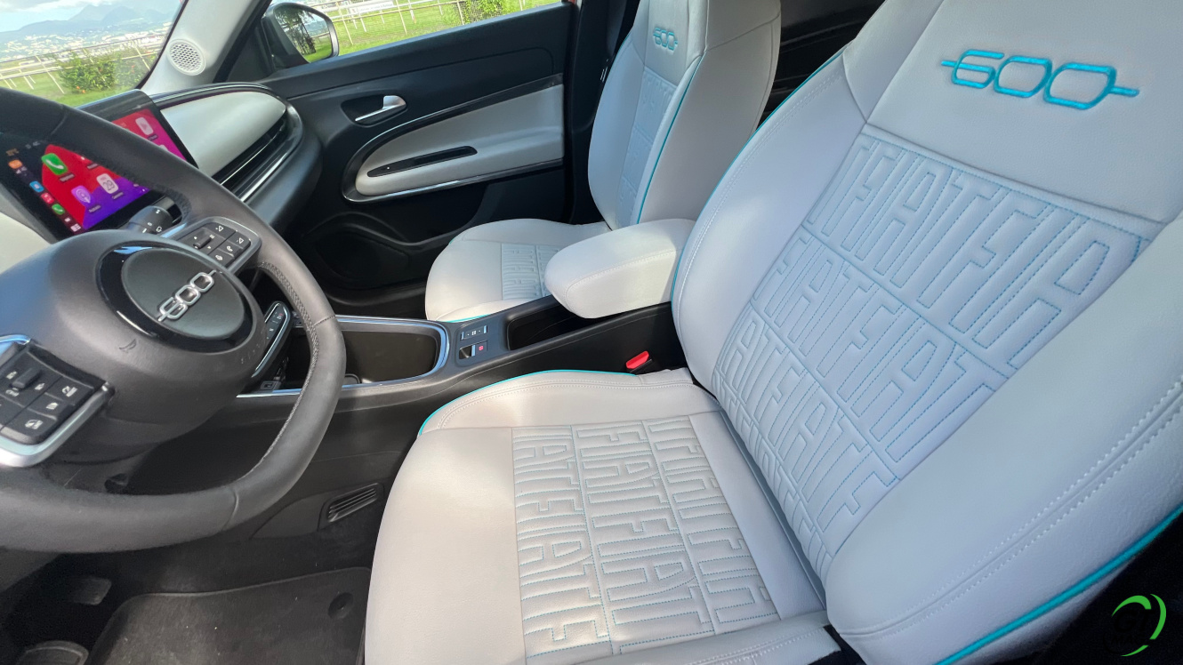 A l’intérieur grâce à son format de petit SUV, la 600 est assez habitable lumineux et spécialement bien agencé… En finition de notre essai ‘La Prima’, la 600e arbore de jolies surpiqûres sur les sièges c’est plutôt agréable au touché comme en visuel. On y trouve une planche de bord tout en rondeur et toujours dominée par l’écran central d’infodivertissement de 10 pouces, ainsi qu’un volant à deux branches. Mieux encore : comme sur la petite, les sièges de la grande s’habillent aussi de tissus ou (faux) cuir au monogramme Fiat. Seul bémol : il n’y a pas un plastique moussé ou agréable au toucher cela reste un point faible… Autre point a ne pas négliger une visibilité moyenne un peu gâché par un gros montant de pare-brise… J’ai tout de même bien aimé cet intérieur vraiment cosi dès le 1er regard… È tutta una grandé... Bellissimo… Ah oui, vous pouvez créer votre propre ambiance intérieure grâce à une lumière ambiante et l’auto radio personnalisable avec 8 coloris.