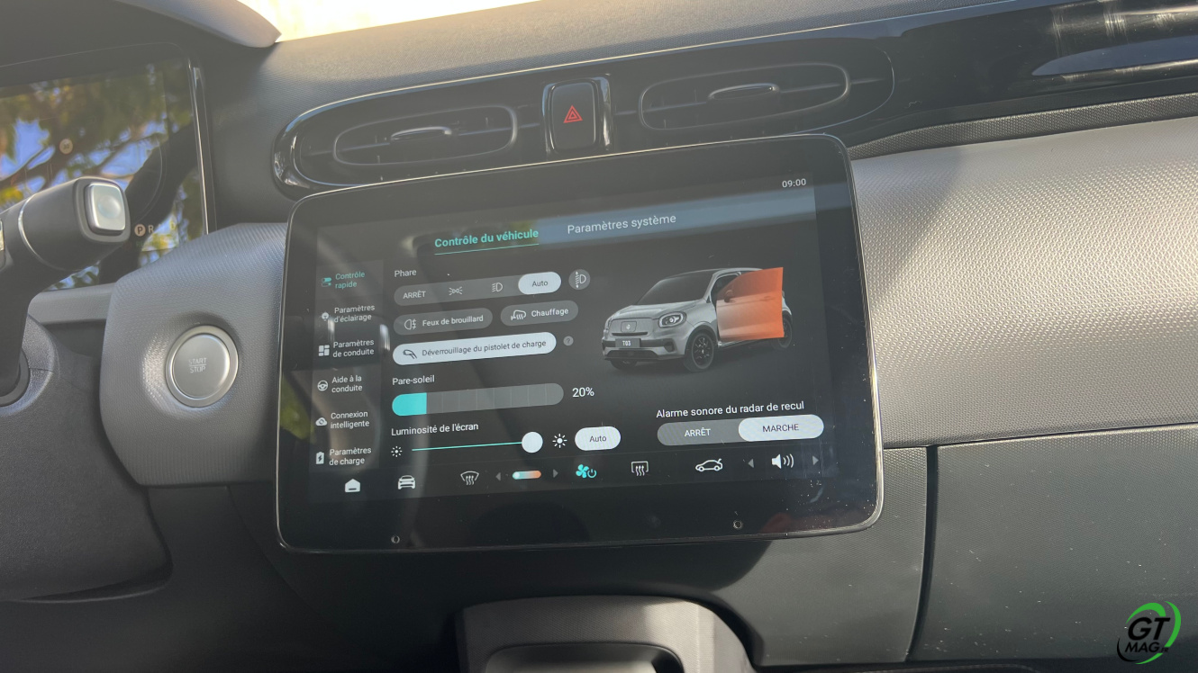 Il faudra faire sans Android Auto ni Apple CarPlay et oui tout cela devrait arriver courant 2025… 10 systèmes d'aide à la conduite de dernière génération sont malgré tout bien là (ACC, CCS, FCW, AEB, LDW, ISA, BSD, DOW, LKA, DDAW, verrouillage en cas d'alcoolémie positive)… Vous aurez également le Frein à main électrique, la climatisation automatique, le volant en cuir synthétique, les rétroviseur à réglage électrique, les vitres avant et arrière électrique, une clé Bluetooth, un capteur de stationnement arrière et la caméra de recul, un toit panoramique avec pare-soleil électrique Côté Info-divertissement une interface intuitive avec écran de 8', une console centrale 10' avec un vrai système de navigation, le Wi-Fi et 4G, un contrôle des applications, des jantes en alliage de 15 pouces, 2 airbags conducteur et passager avant + 2 airbags latéraux avant + 2 airbags latéraux arrière