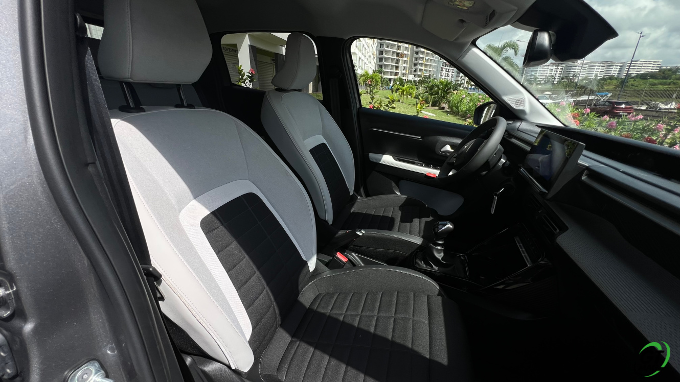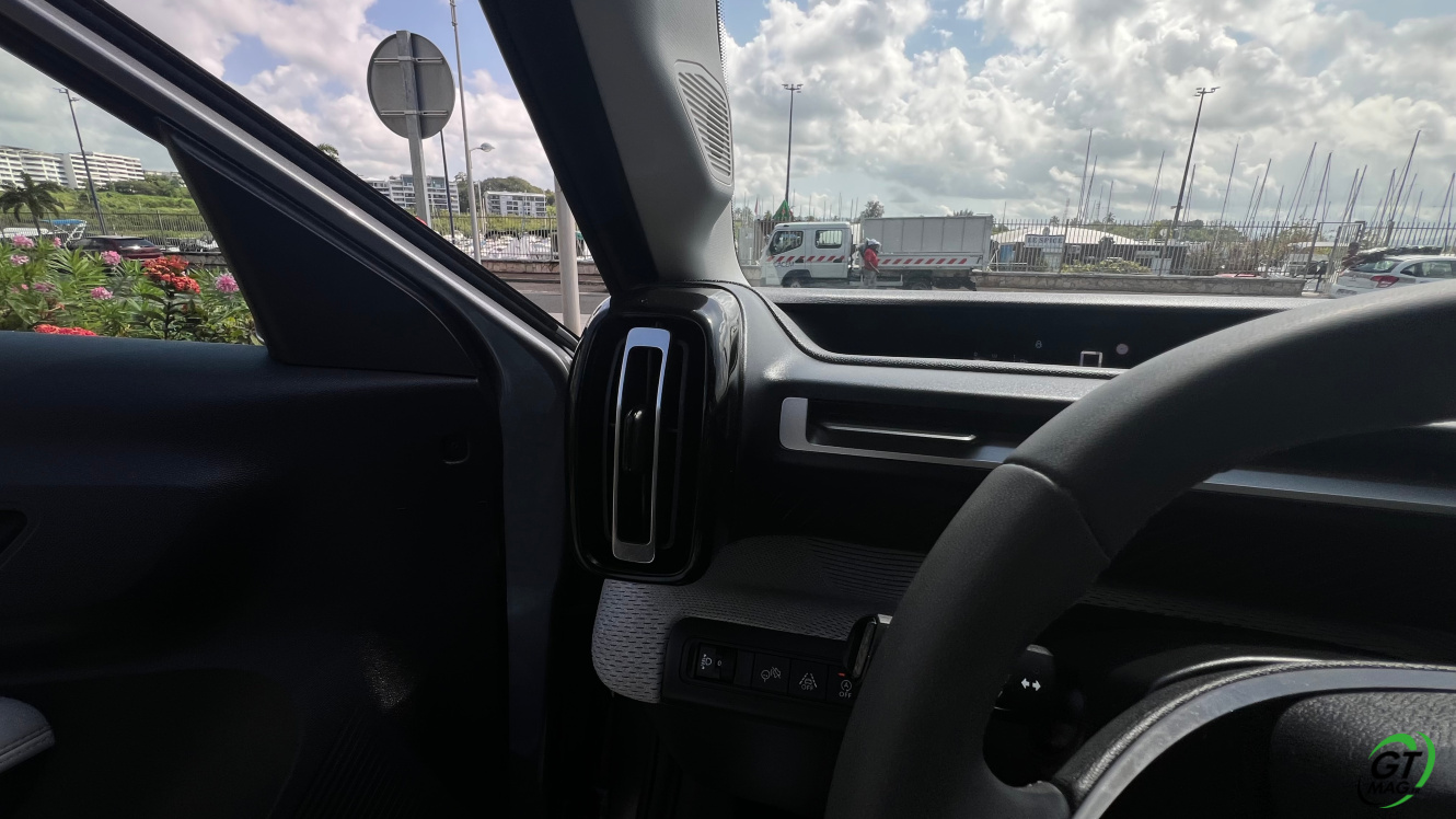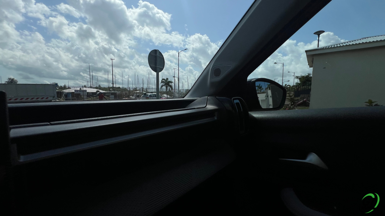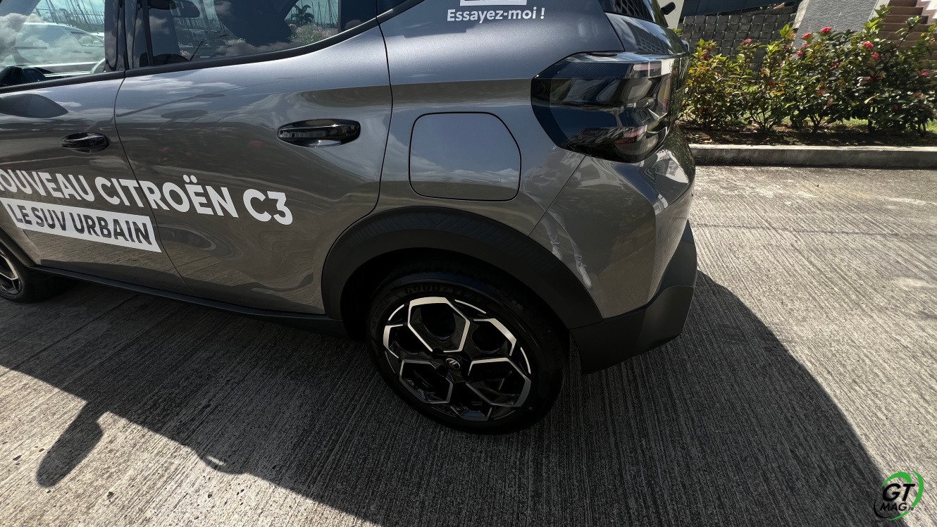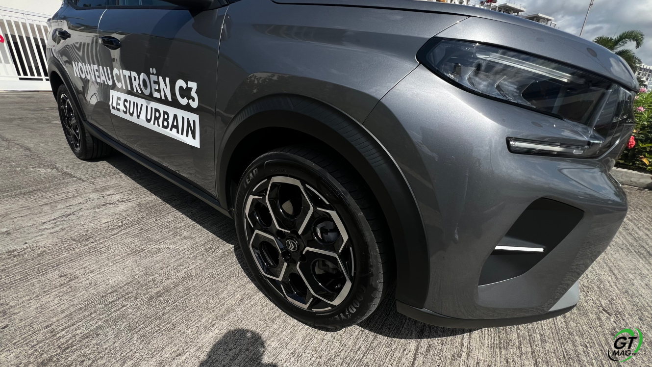 Le premier niveau, « You », est bien pourvu : suspensions « Citroën Advanced Comfort » nouveau système d’affichage tête haute « Citroën Head Up Display », station d’accueil pour smartphone, reconnaissance des panneaux de vitesse ou encore allumage automatique des feux de croisements. Le second, « Max », notre essai de ce matin en Martinique ajoute les jantes de 17 pouces (la version « You » n’a que des enjoliveurs, de 16 pouces), une peinture bi-ton, des barres de toit, un écran tactile de 10,25 pouces, une banquette arrière fractionnable 2/3 – 1/3 ou la climatisation automatique. La Citroën C3 se distingue par un design extérieur audacieux, intégrant des lignes plus dynamiques et des éléments stylistiques modernisés. La face avant arbore une calandre élargie, dotée du nouveau logo de Citroën, et des feux led effilés, qui lui confèrent une identité visuelle forte. Le style général s’apparente à celui d’un SUV. Finalement, l’image est bien plus moderne pour cette nouvelle C3.
