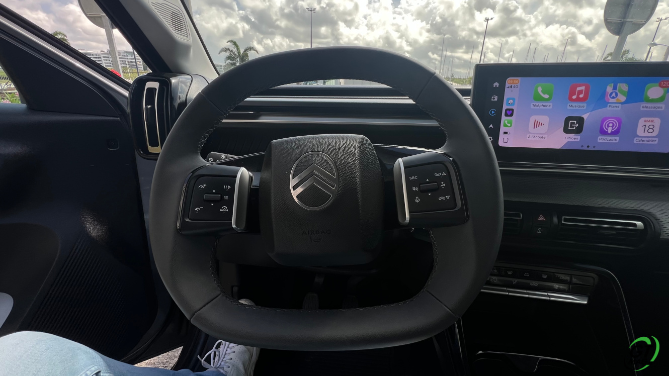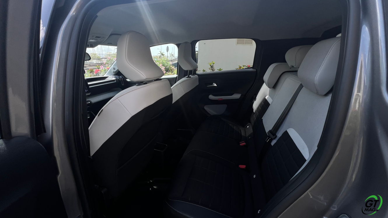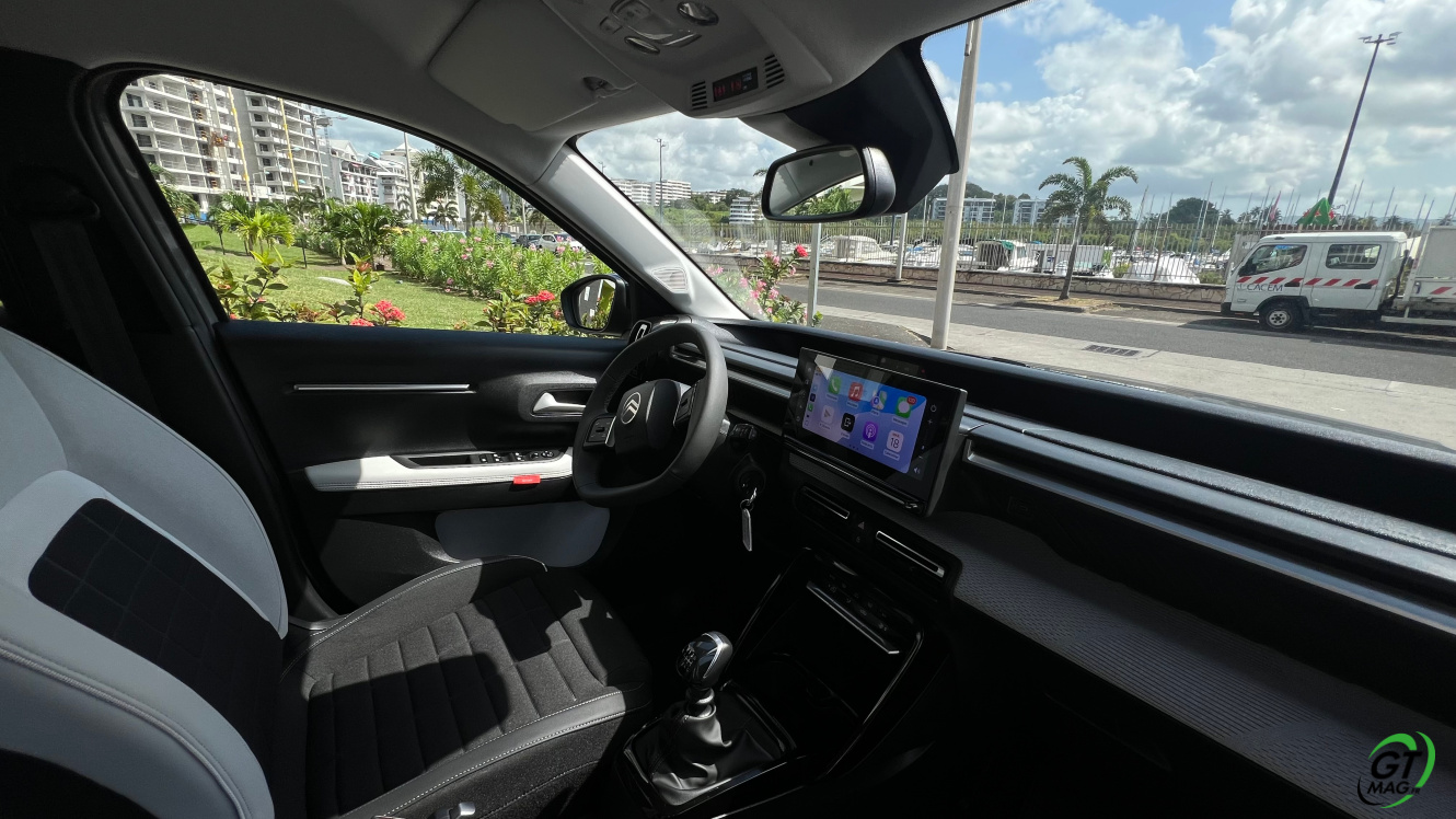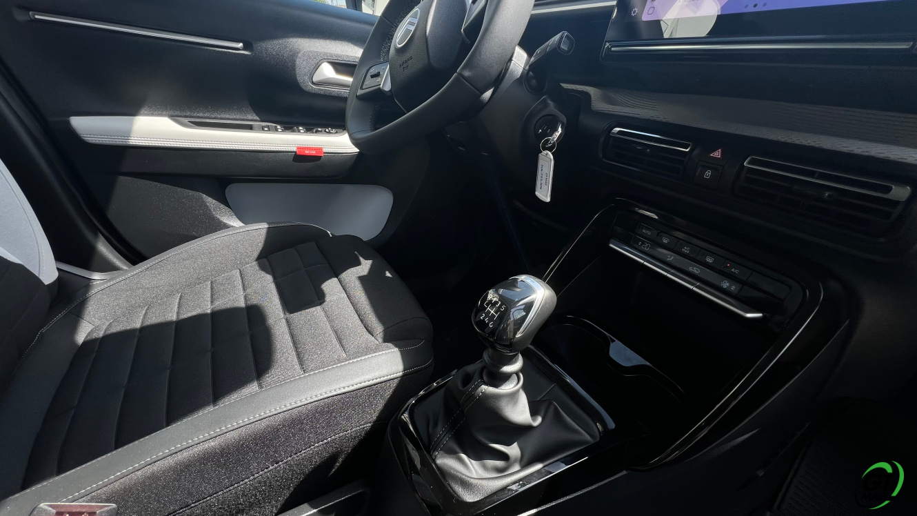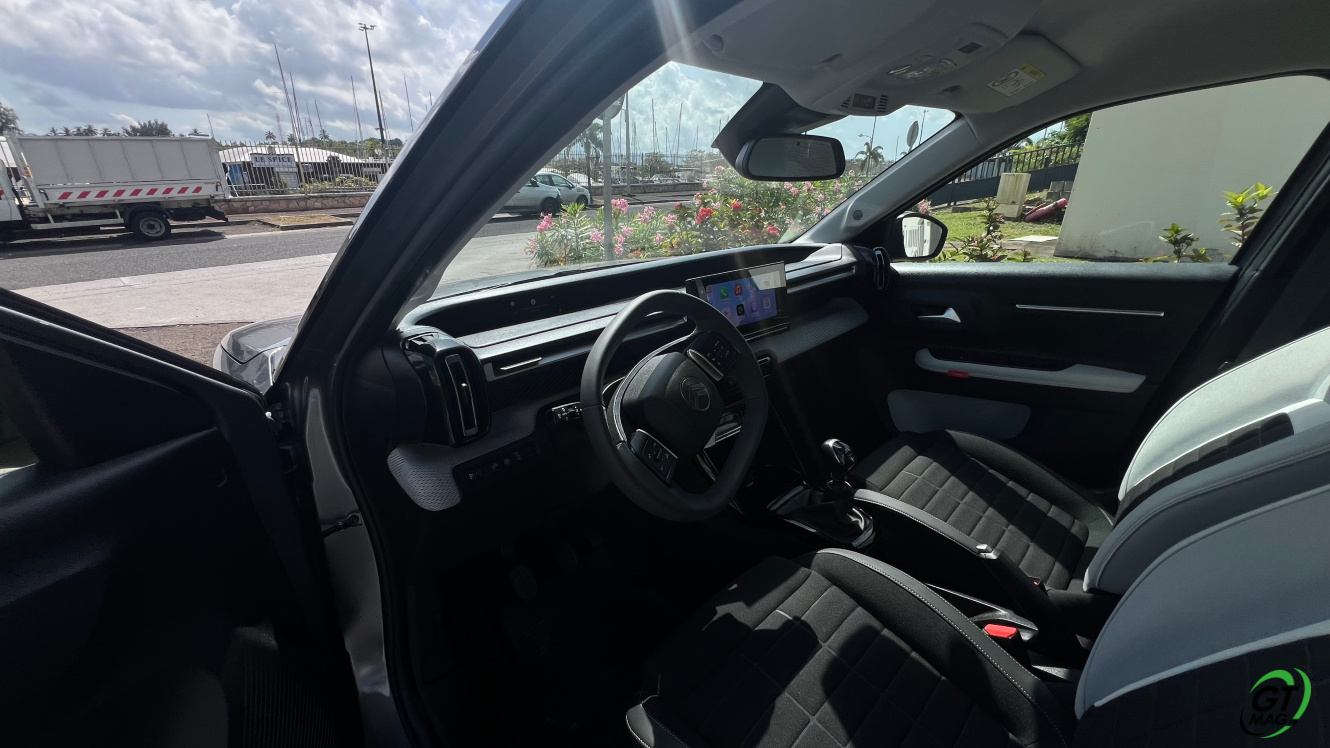 L’intérieur a été entièrement repensé pour offrir un confort optimal. Les sièges, inspirés de ceux du modèle C4, bénéficient d’un nouveau rembourrage, offrant un excellent soutien pour les longs trajets, disponible sur le niveau Max. La qualité des matériaux a été revue à la hausse, tout comme la position de conduite. Par ailleurs, elle dispose d’un petit volant, au-dessus duquel le conducteur peut contrôler les compteurs. Cependant, la qualité des plastiques fait les frais des réductions de coûts. Une bande textile qui recouvre la planche de bord permet de sauver cet habitacle d’une ambiance trop austère. Le coffre est vaste, avec ses 310 litres. Son accès n’est pas aisé et les sièges arrière ne sont pas modulables. L’habitacle dispose d’un écran tactile central de 10 pouces, intégrant le système d’infodivertissement Citroën Connect, compatible avec Apple CarPlay et Android Auto.