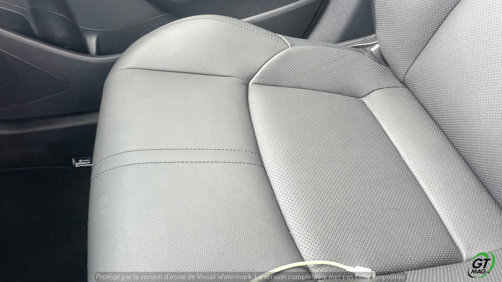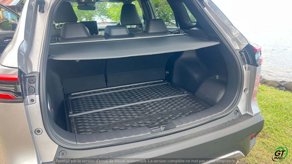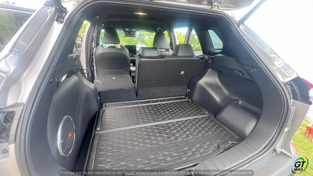 Le profil, lui, met en scène des ailes légèrement galbées, des jantes en alliage’ de 18’’ et des protections en plastique noir courant sur toute la partie inférieure de la carrosserie. Une élégante lame chromée vient dynamiser la ligne de toit, qui s’incline légèrement vers l’arrière, meublé par de larges blocs de feux. Le hayon, doté d’une ouverture entièrement motorisée, est une exclusivité de la finition haut de gamme «SRX», celle de notre modèle d’essai. On termine cette revue du Toyota Corolla Cross avec l’antenne de toit type requin et pour un plus bel effet des ornements supérieurs de vitres chromés… En prime de ces nouveautés, le SUV nippon peut également revêtir une finition GR Sport aux pare-chocs et jantes spécifiques ainsi qu'à la suspension abaissée de 10 mm.