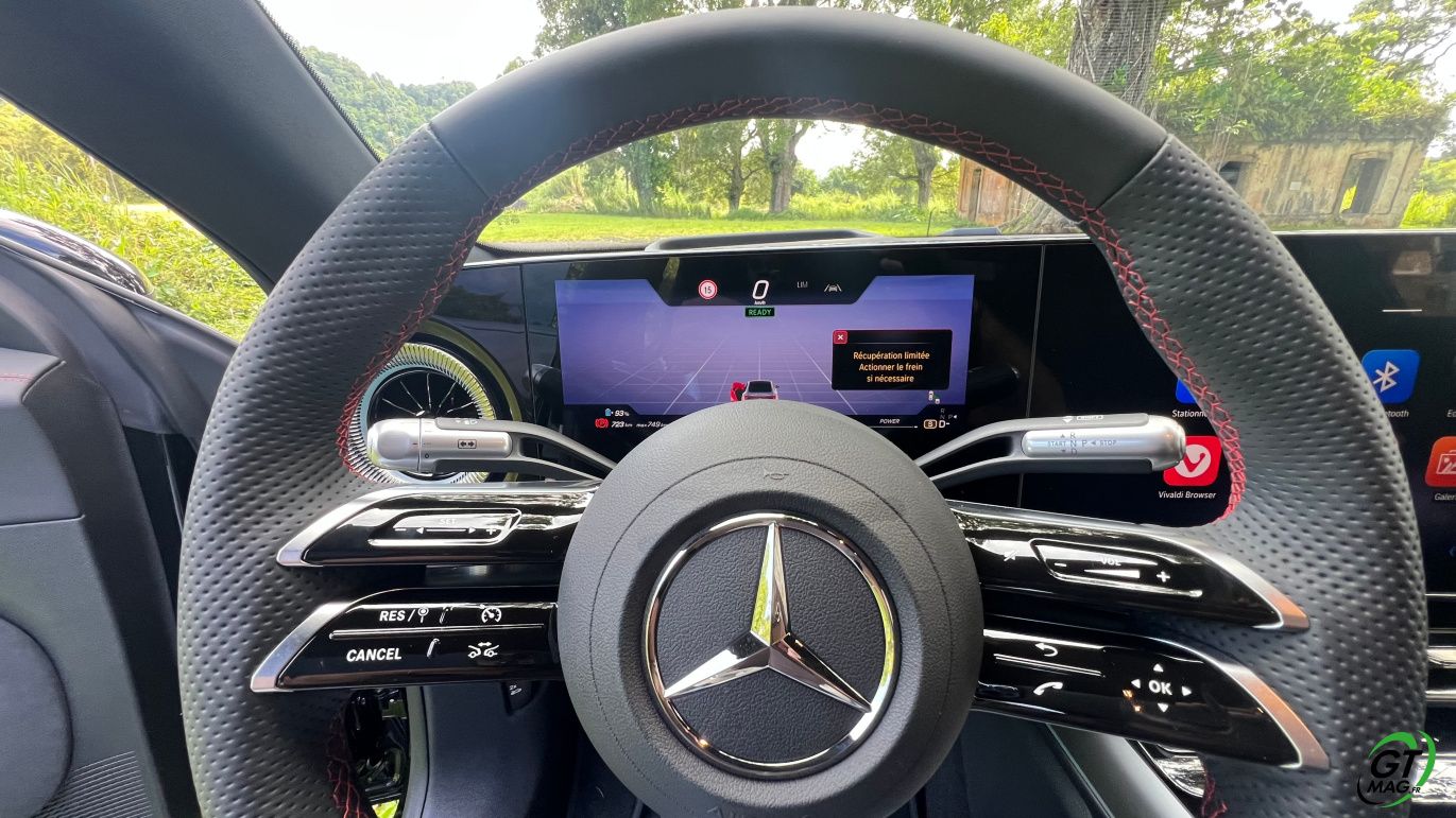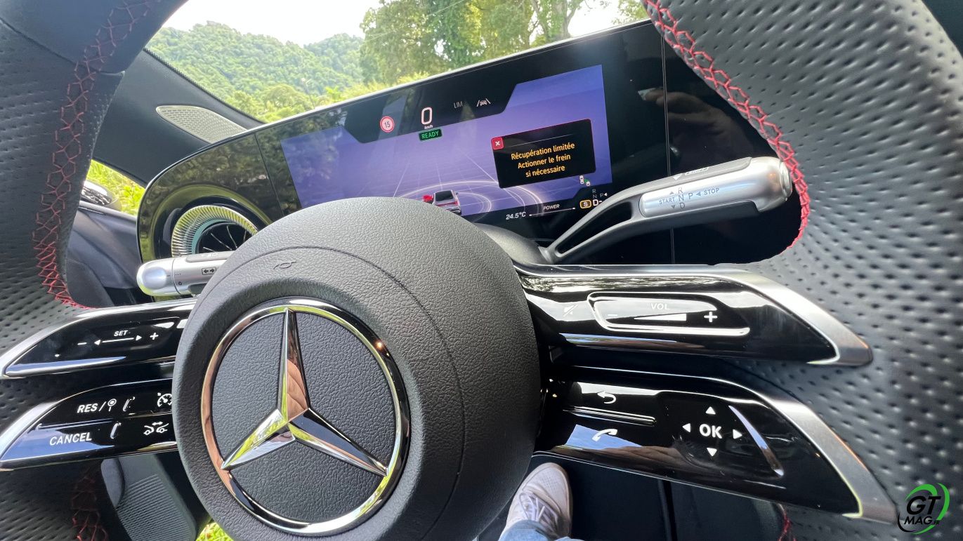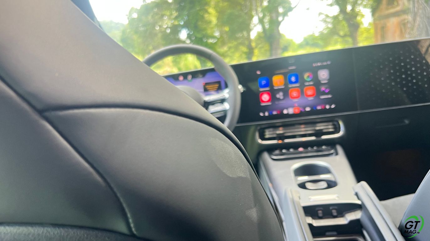L’écran en lui-même est plutôt bien structuré, mais son fonctionnement diffère des systèmes Mercedes actuels. En effet, plutôt qu’un menu principal divisé en catégories, toutes les applications et menus sont regroupés dans un grand tiroir, à la manière d’un smartphone. La commande de la climatisation se fait également via l’écran, mais reste constamment visible. Sur la console centrale, seuls quelques boutons restent présents : ce sont ceux destinés aux modes de conduite, aux caméras de stationnement, à la désactivation de l’écran, aux feux de détresse, à l’assistant vocal et au volume. Les deux pavés tactiles sur le volant, qui permettaient auparavant de contrôler l’écran conducteur à gauche et l’infodivertissement à droite, ont disparu. Le volant, lui, sera prochainement mis à jour, puisqu’un tout nouveau modèle a fait ses débuts sur la Mercedes CLA avec… de vraies molettes physiques pour le volume et le régulateur de vitesse !