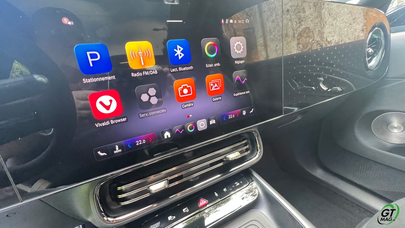 À bord, on découvre le « MBUXSuperscreen » Mercedes qui s’étend, de manière assez massive, sur toute la largeur de l’habitacle. Derrière une grande surface vitrée se trouvent l’écran du conducteur (10,25 pouces) et l’écran central (14 pouces). En option, un écran supplémentaire (14 pouces) est disponible pour le passager avant. Sans cette option, le passager aura, face à lui, une grosse pièce en plastique noir décorée d’étoiles. Ça impressionne, surtout avec l’écran passager. Si vous choisissez l’option écran passager, ce dernier bénéficie également d’un écran de 14 pouces, pour regarder des vidéos en streaming ou même jouer à des jeux pendant le trajet, grâce à un système d’assombrissement de l’écran qui évite de distraire le conducteur. Placées à gauche et à droite de ce « bloc », les ouïes de ventilation ont un aspect original, ce qui est moins le cas des ouïes placées sous l’écran central.
