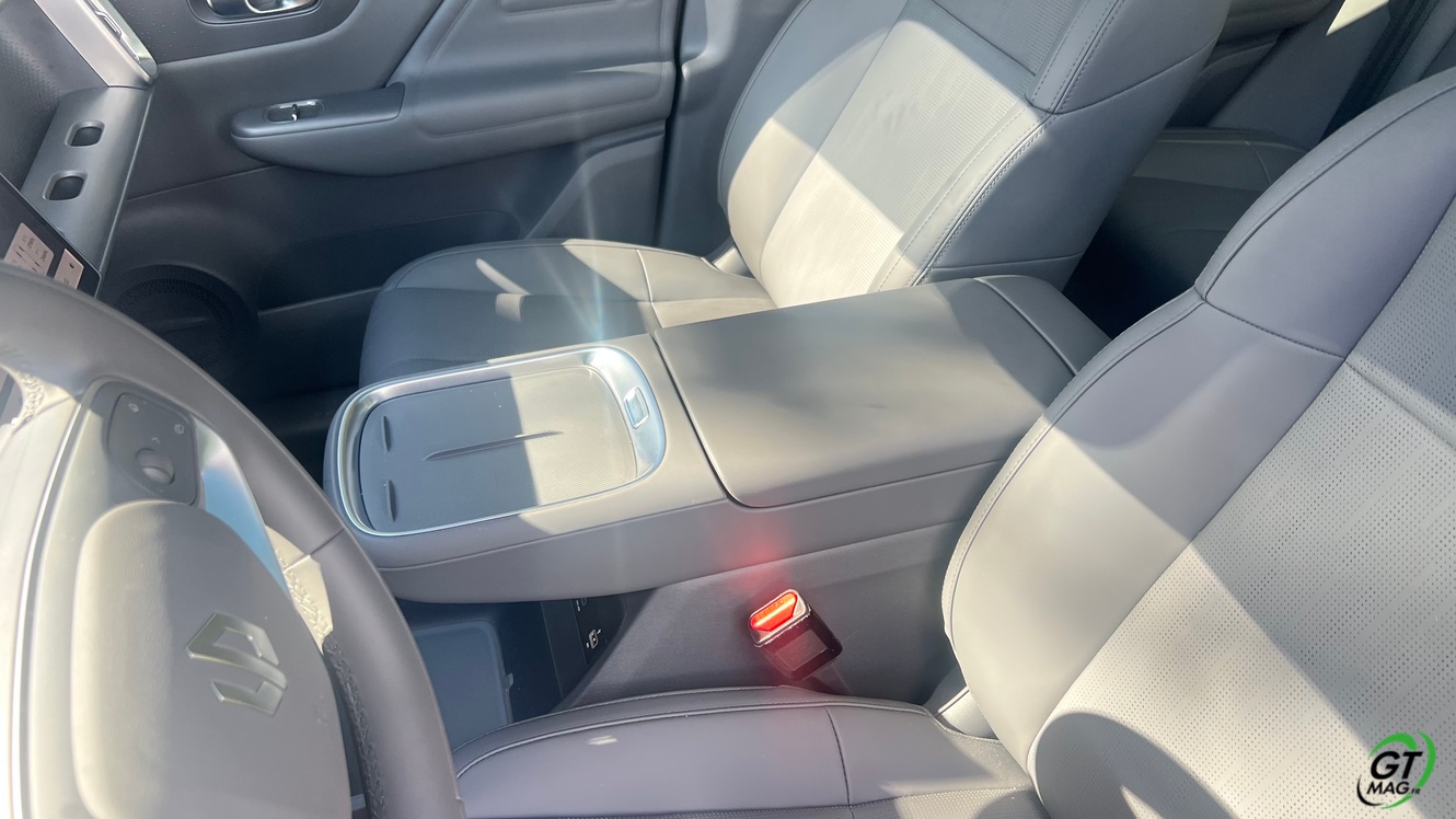 Dans l’habitacle, le Leapmotor B10 suit son propre chemin avec une planche de bord à deux étages. À notre grand étonnement et plaisir, on trouve des buses de ventilation, ainsi qu’un espace de rangement bien pratique devant le passager. En sus, il y a un grand bac dans la console centrale et deux porte-gobelets escamotables. Une chose est sûre : ce ne sont pas les rangements qui manquent ! D’ailleurs, toujours sur le point du rangement et de l’habitabilité : le Leapmotor B10 joue bien de sa taille pour offrir un habitacle généreux. Devant comme derrière, tous les passagers seront bien assis, tandis que le coffre taille à 430 litres. Mieux encore, il y a 25 litres d’espace sous le capot. Pratique pour les câbles ! Côté infodivertissement, tout passe va une grande dalle tactile de 14,6 pouces – en plus d’une instrumentale digitale de 8,8 pouces. Quand on dit « tout », c’est vraiment « tout », puisque le B10 ne présente aucun bouton. Pas même pour régler les rétroviseurs…