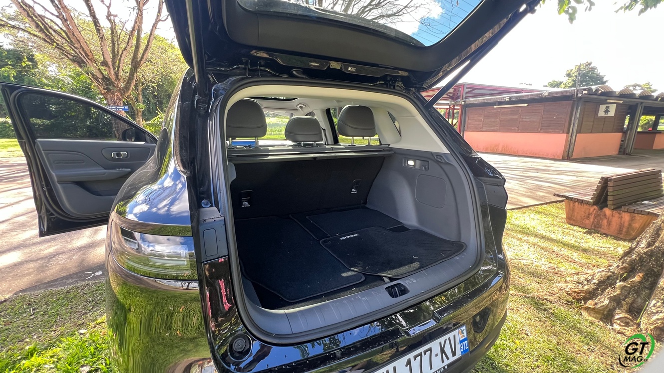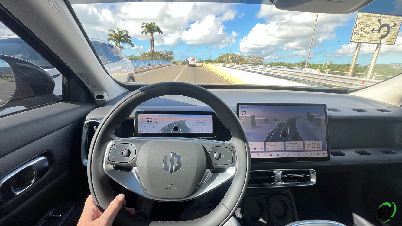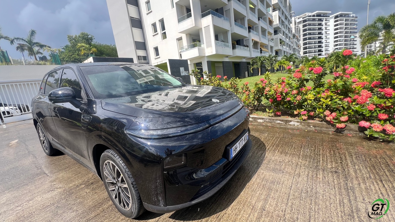 Les Leapmotor B10 et C10 partagent une plateforme et leurs technologies. Pas étonnant donc de retrouver le moteur électrique de 218 ch sur le train arrière du petit crossover. Il présente aussi une suspension McPherson à l’avant, 5 bras à l’arrière et même une répartition du poids 50/50. Ce dernier élément est sans doute aidé par les batteries. Eh oui, il y a en a deux au catalogue on l’a vu. En Martinique la grande batterie présente une capacité de 67,1 kWh, ce qui lui permet d’offrir une autonomie de 434 km. Elle charge à 168 kW elle prendra 20 min pour passer de 10 à 80 % de charge sur une borne rapide. Côté consommation et d’après mes petits calculs, il faudra toutefois tabler sur un appétit moyen gravitant autour des 16 à 18 kWh/100 km, soit près de 360 km à 390 km d’autonomie. Ma conduite, mon style ont été plutôt raisonnable flirtant parfois avec une écoconduite que je maitrise très bien, mais aussi des moments d’accélérations voulues et prolongées sur notre rocade ou autoroute…