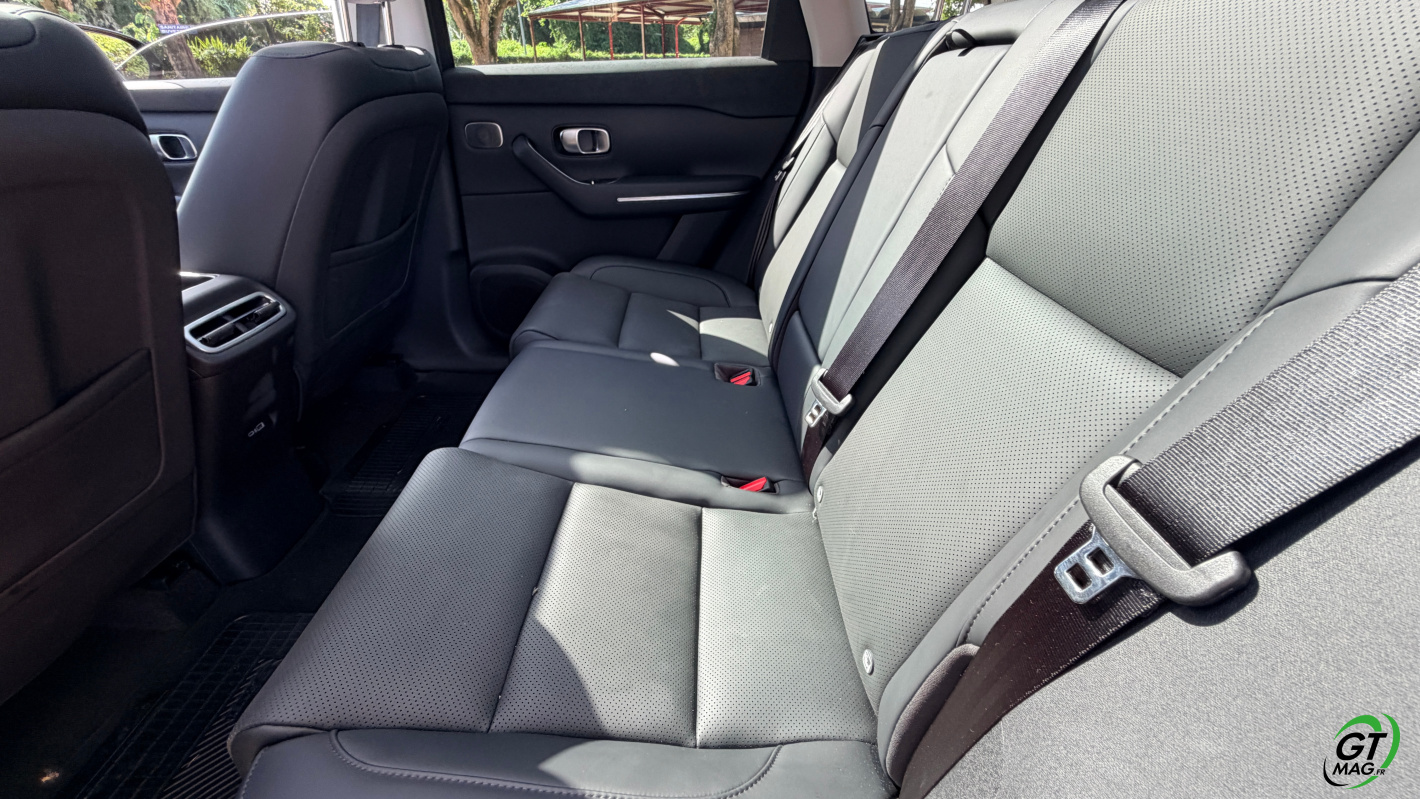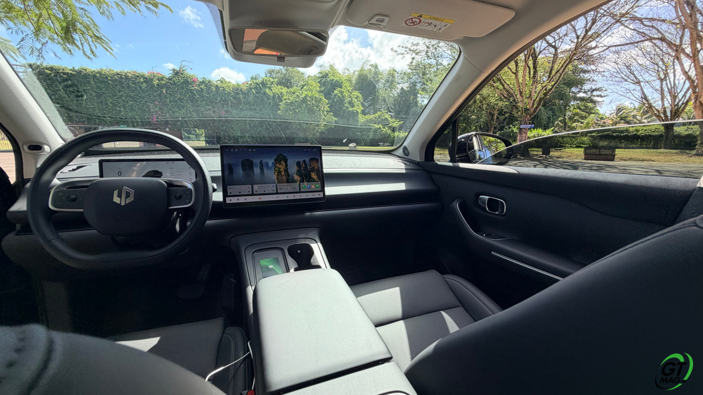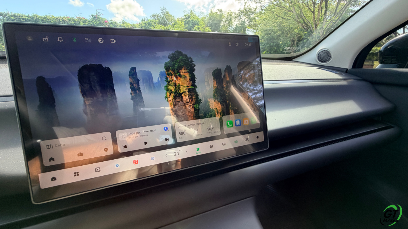 Plutôt réussi, l’habitacle du Leapmotor C10 REEV est une heureuse surprise. Très épuré, le mobilier de bord est constitué de matériaux de qualité correcte, seuls quelques assemblages demeurent perfectibles. Comme chez Tesla, un grand écran central de 14,6 pouces centralise toutes les commandes de la voiture alors que l’instrumentation dispose d’une dalle de 10,25 pouces. L’interface multimédia de la voiture est assez réussie en termes de fluidité et d’accessibilité, mais on peut regretter l’absence de toute compatibilité Apple CarPlay et Android Auto, mais les choses devaient changer courant 2025… Malgré cela Leapmotor a fait du super travaille à l’intérieur de son C10 du moins en termes de matériaux et d’assemblage.