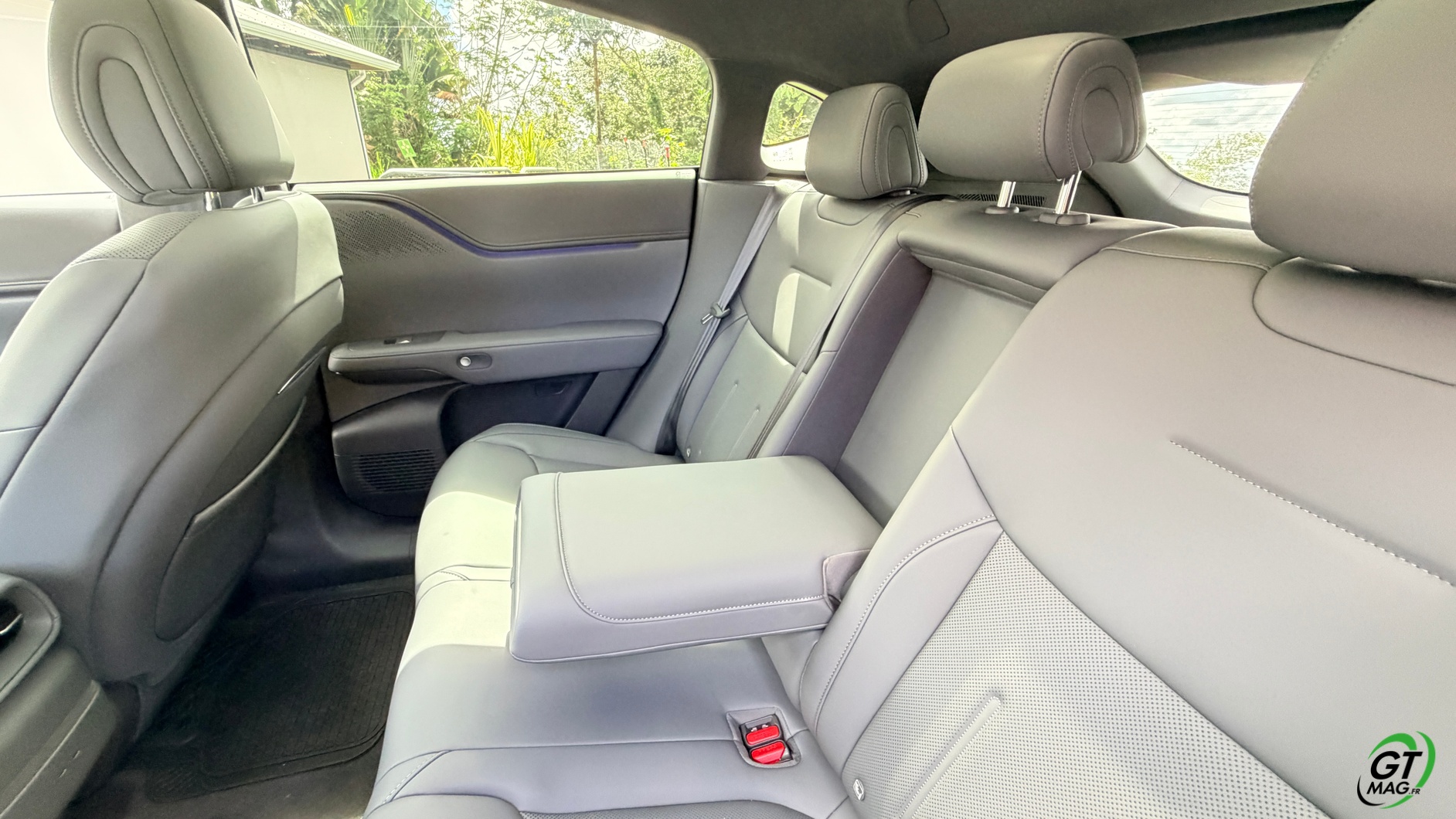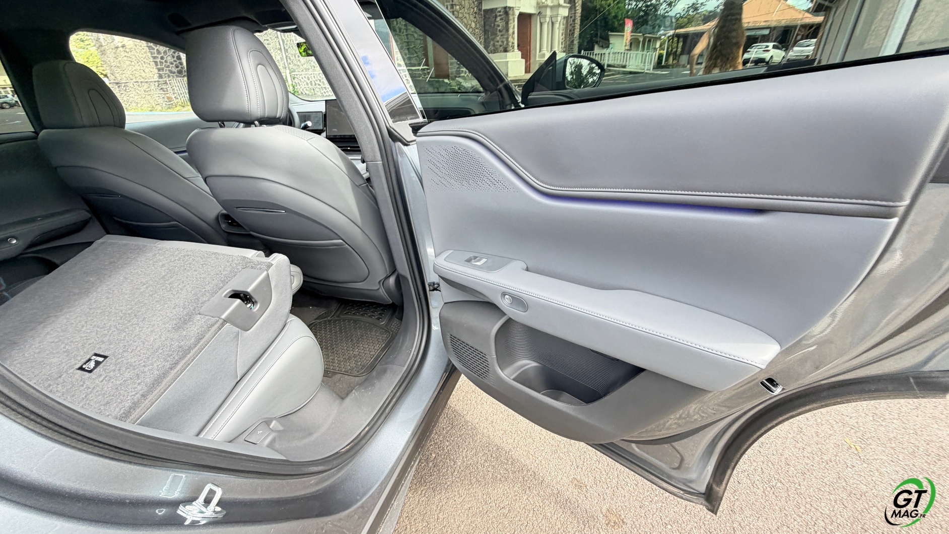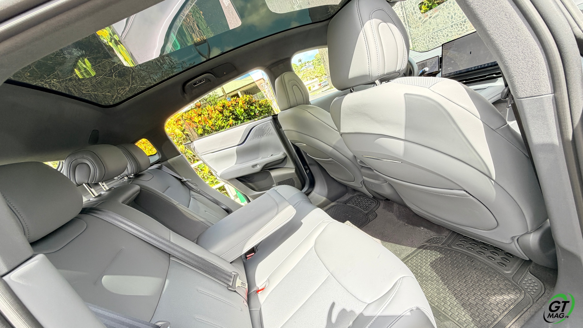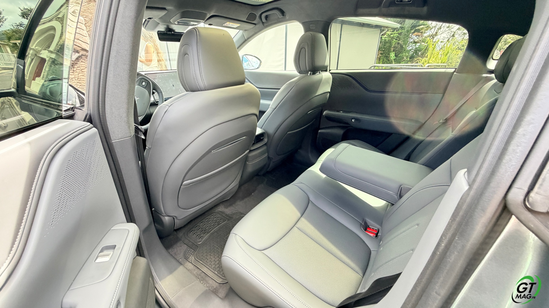 La dalle derrière le volant mesure 10,25 pouces et peut être personnalisée selon les envies du conducteur : Waze, streaming (type Spotify), GPS natif, aides à la conduite, etc. La dalle passe à 15,6 pouces sur le modèle 2025 et notre essai. De plus, la Xpeng G6 Performance 2025 peut être entièrement gérée depuis un smartphone grâce à une application simple d’utilisation, permettant de consulter la charge, l’autonomie et de commander certaines fonctions du véhicule. Les passagers arrière profitent d’un espace généreux aux jambes (grâce à l’absence de tunnel central), d’une assise moelleuse, d’un accoudoir confortable et d’un toit panoramique fixe de 2,12 m². Les dossiers peuvent s’incliner de 11 degrés pour améliorer le confort.