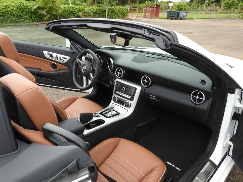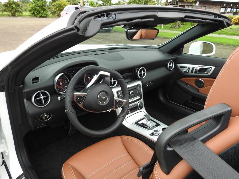La nouvelle AMG, elle, reçoit un V6 biturbo de 3,0 L qui se substitue aux deux moteurs offerts auparavant pour la SLK 350 (V6 de 302 ch) et la SLK 55 AMG (V8 de 415 ch). Ce moteur de 362 ch produit 384 lb-pi dès qu’il tourne à 2 000 tr/min, ce qui lui procure une capacité d’accélération étonnante et lui permet d’abattre les 100 km/h en 4,7 secs. C’est un dixième de seconde de plus que la SLK 55 AMG, mais qui s’en souciera ?