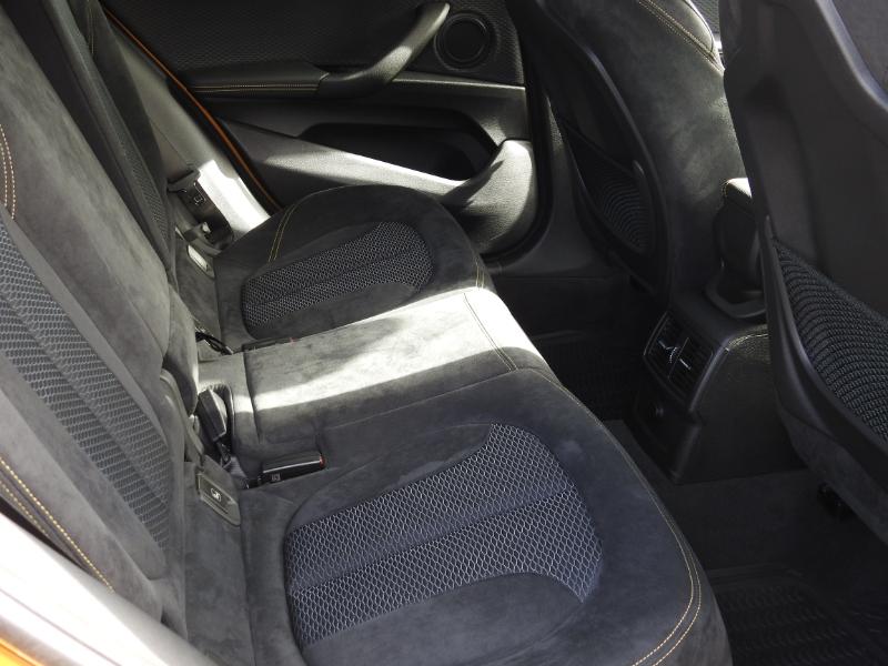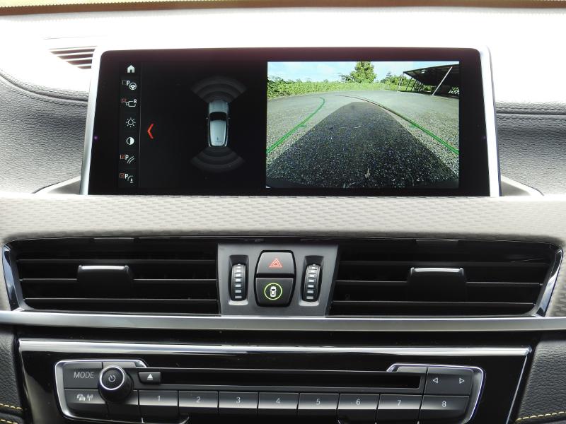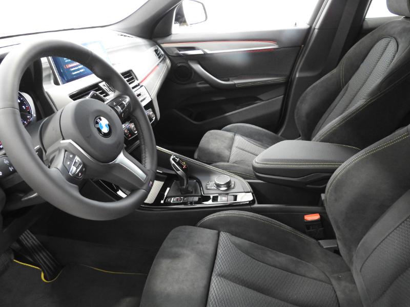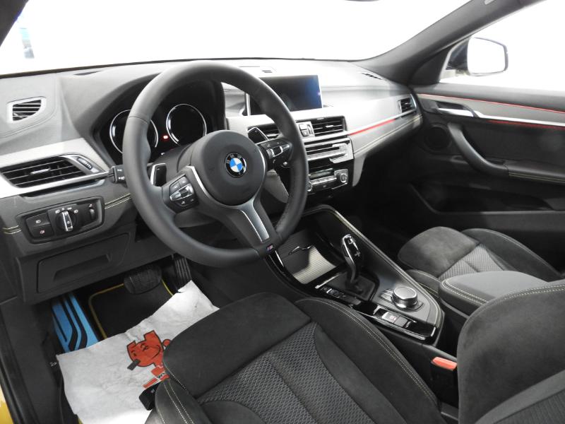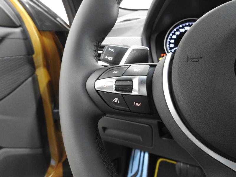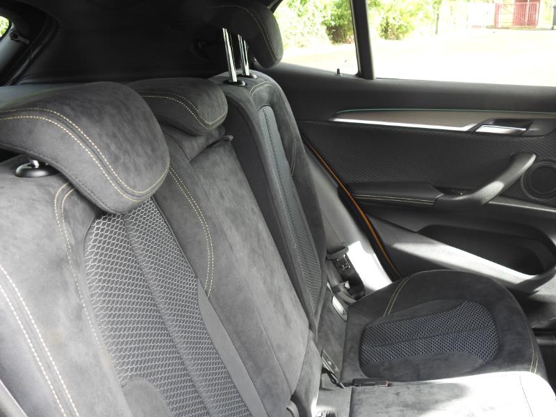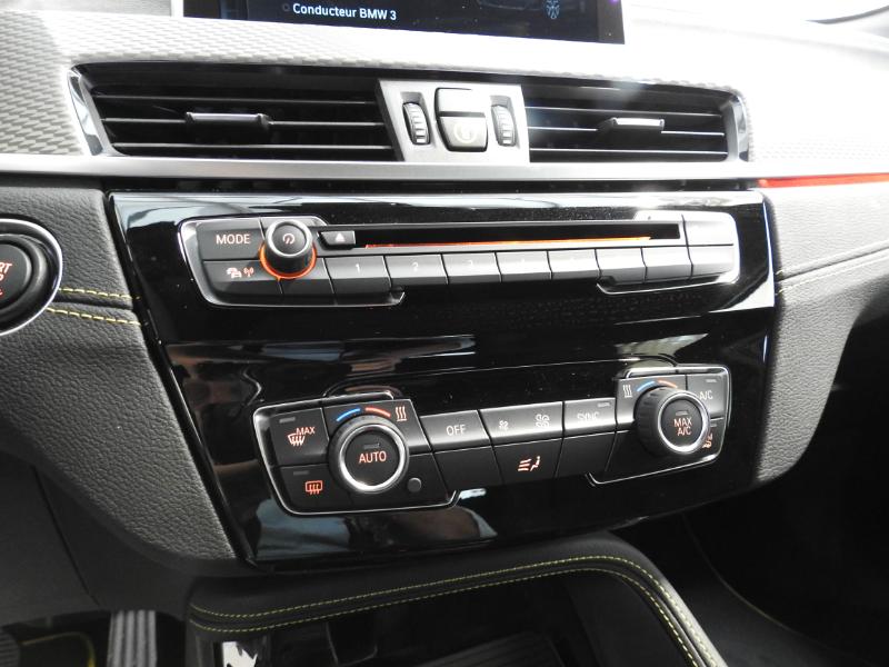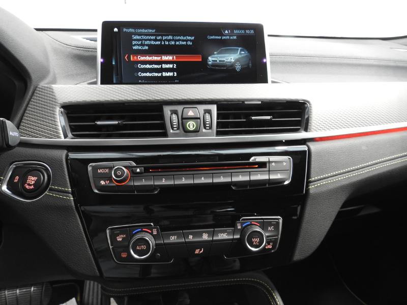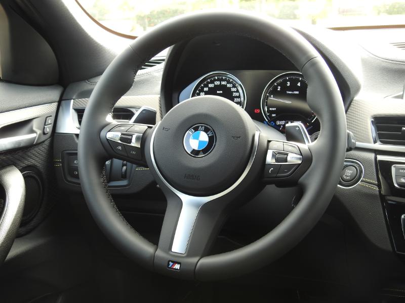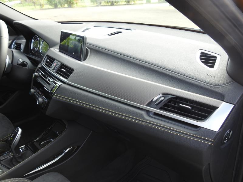 Les conducteurs d’une BMW X1 ne seront absolument pas dépaysés. L’habitacle ressemble trait pour trait à ce modèle. Mais une fois installé derrière le magnifique volant M, seule la position de conduite changera. En effet dans ce X2, vous serez plus prêt de la route. Normal, il se veut plus dynamique ! A l’intérieur, les finitions sont impeccables, c’est très bien fini avec des petits détails qui tuent dans notre version. Des surpiqûres jaunes et les contours de tapis de sols de la même couleur viennent donner un peu de gaité à cette habitacle.