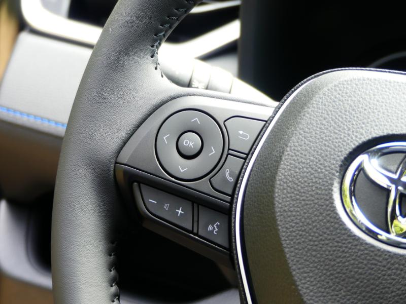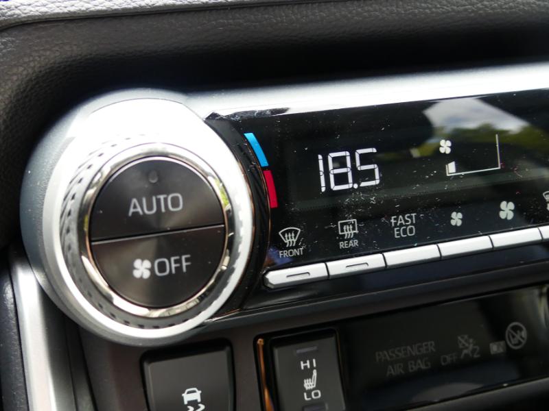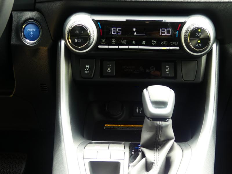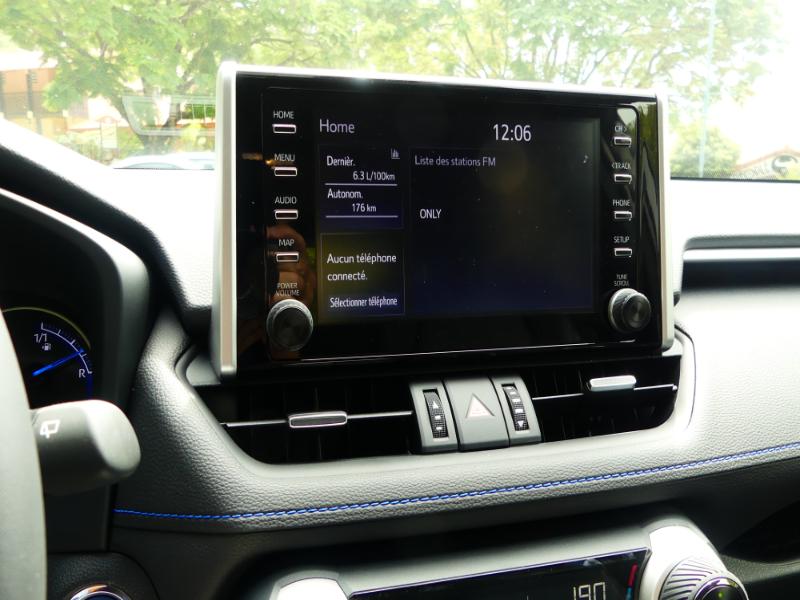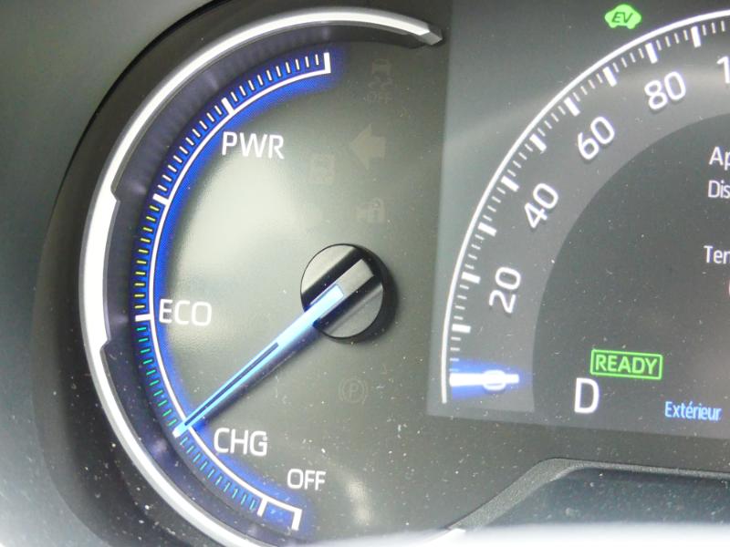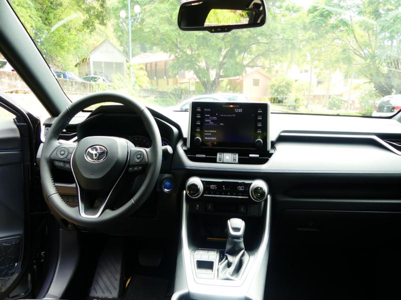 A l'intérieur notre modèle joue la séduction avec un choix de matériaux bien supérieur au segment... Une sur-couture bleue n'est pas pour déplaire et l'ensemble du tableau de bord inférieur comme supérieur fait étal d'un matériau moelleux qui rappelle les modèles les plus Premiums essayés dernièrement sur Grantomobil.fr... Les fonctions sont simples et accessibles sans être à foison ce qui permet une prise en main quasi immédiate de ce RAV 4 Hybride 218 cv 2 roues motrices nouvelle génération... Un écran 8 pouces donne du volume à l'envie de pianoter... Au Top, un écran à cristaux liquides à la place du rétroviseur central juste si vous êtes trop chargé à l'intérieur par exemple, une caméra remplace alors la vision obstruée, génial non ?! L’adoption de la commande électrique pour le frein de stationnement libère une place appréciable pour le téléphone portable et son chargement par induction... Pour ce qui est de la conduite améliorée, le RAV4 2019 vous propose 3 modes de conduites qui agissent sur la direction, les suspensions et la consommation bien-sur, elle, relevée par nos soins en trajet mixte entre le Lamentin et Saint-Anne, soit 6,5 litres au 100 km ce qui reste moyen par rapport à nos attentes pour ce type de véhicule...